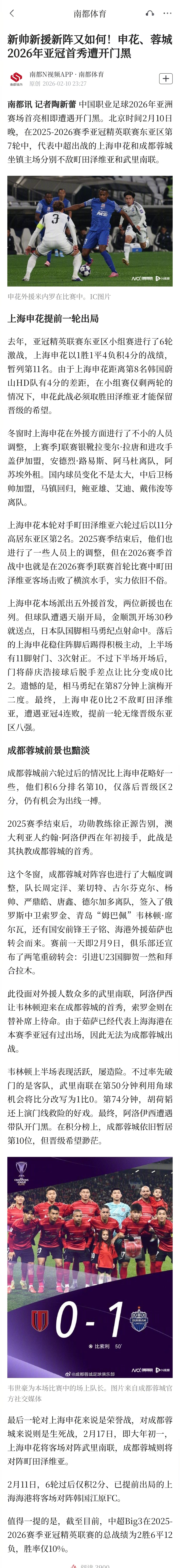 #申花蓉城亚冠首秀遭开门黑#【新帅新援新阵又如何!申花、蓉城2026年亚冠首秀遭开门黑】中国职业足球2026年亚洲赛场首亮相即遭遇开门黑。北京时间2月10日晚,在2025-2026赛季亚冠精英联赛东亚区第7轮中,代表中超出战的上海申花和成都蓉城坐镇主场分别不敌町田泽维亚和武里南联。