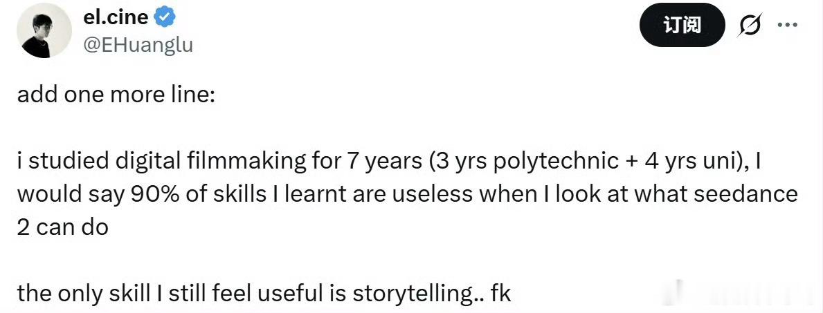海外已夸爆Seedance2.0Seedance的冲击有点类似于之前的 DeepSeek,但又有所不同。重要的是它可以更加连贯、成熟、准确地理解指令的语义,并且创作出相当有质感的内容。现在说真人导演和演员的威胁还太早,但成熟的AI替代制作不够精良的小型团队的影视和短剧作品似乎已经看到了可能。在未来,创意会越来越重要,作为真人而言更独特的情感表达和故事内核也需要被挖掘,还要会运用AI来给自己服务,不然可能真的会被AI“抛在身后”了。