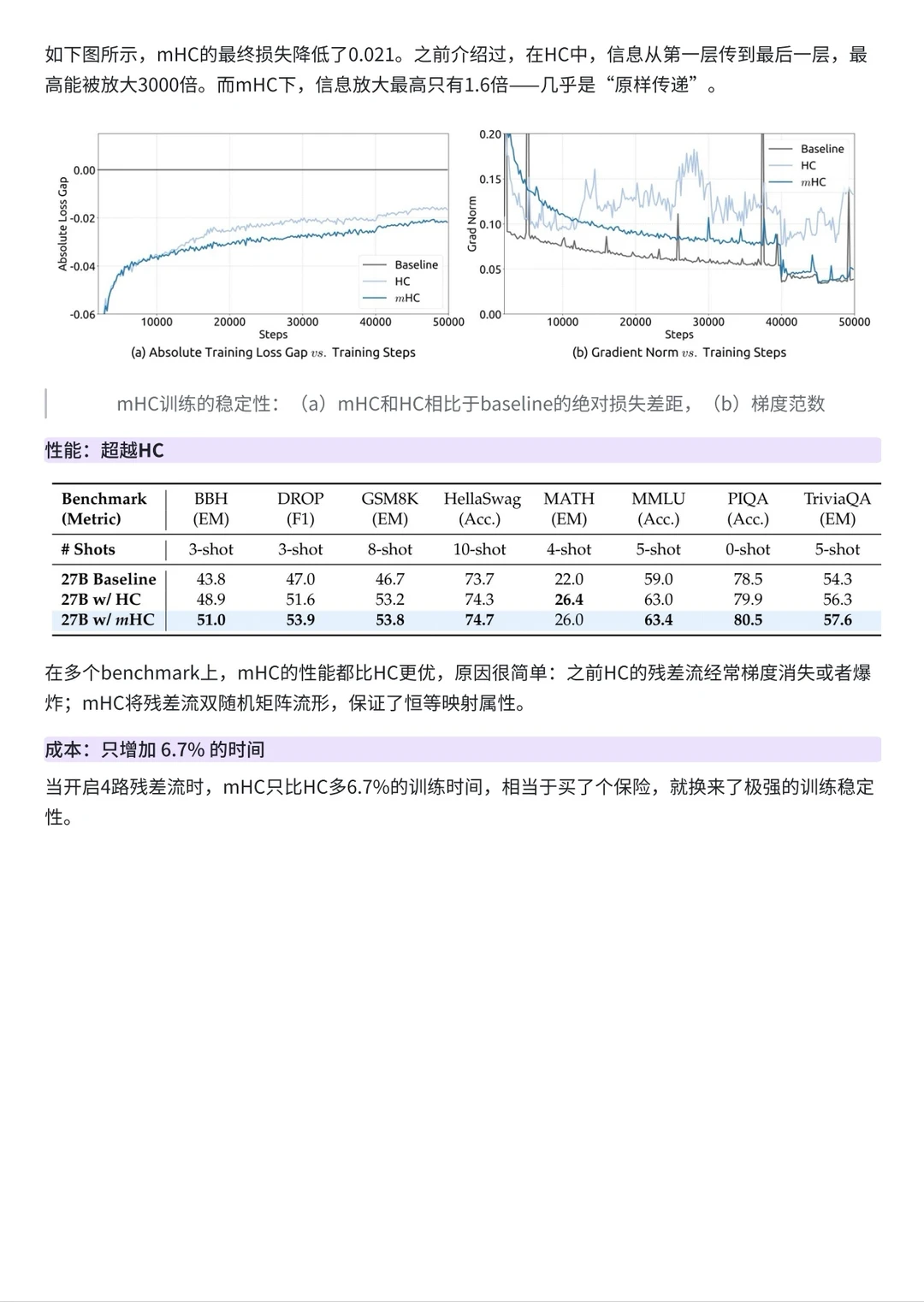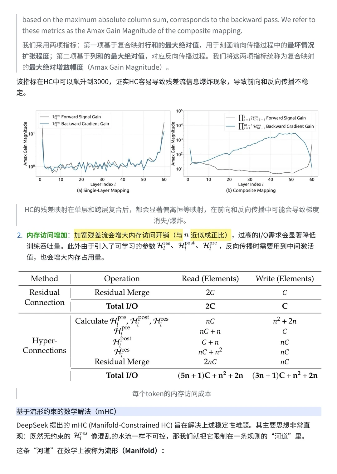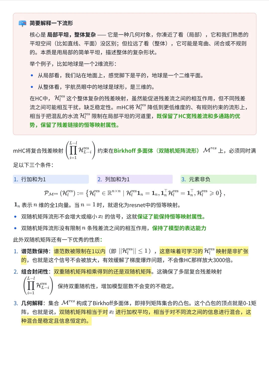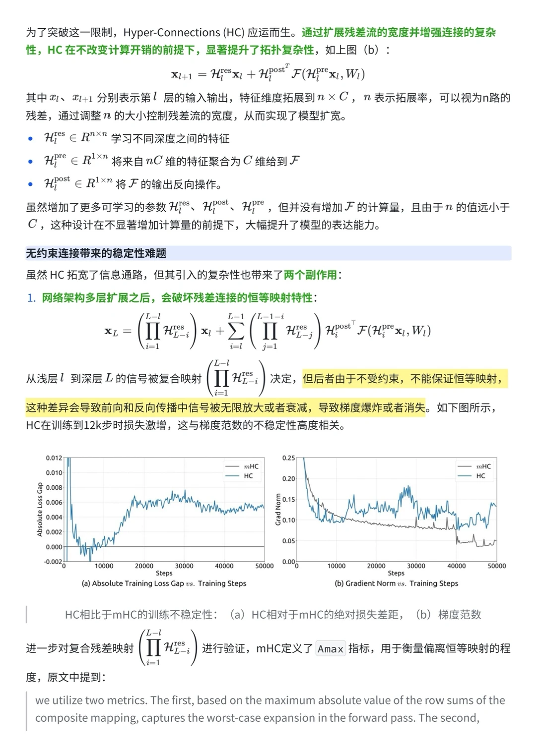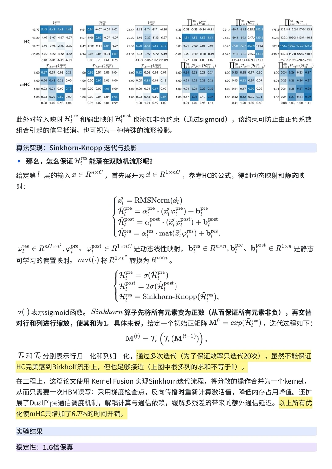 这项工作解决了一个一直存在的问题:为了提升大模型性能,字节曾尝试使用比标准残差连接(Residual Connection)更复杂的 Hyper-Connections (HC),但这破坏了恒等映射属性,导致梯度爆炸和训练崩溃。DeepSeek 的解法非常数学化——通过引入 Sinkhorn-Knopp 算法,将连接矩阵投影到 Birkhoff 多面体(双随机矩阵流形)上,从底层原理上保证了训练的稳定性。