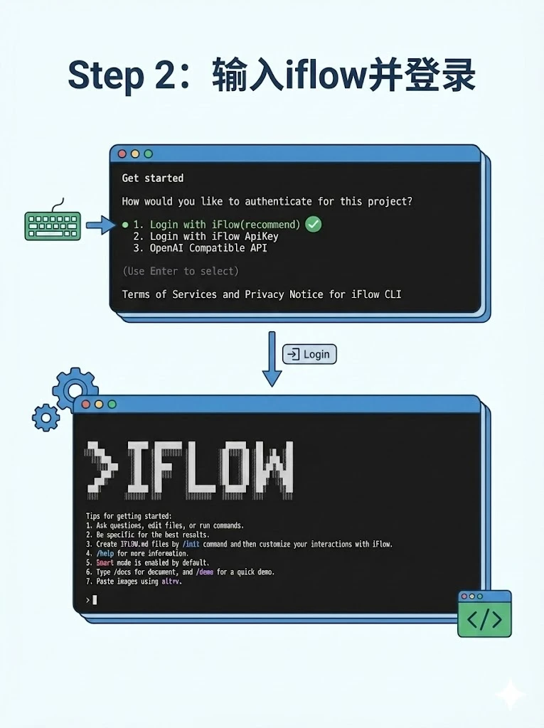 2️⃣登录启动。输入 `iflow` 即可唤起。UI 是我喜欢的极客风,支持中文显示,对国内开发者很友好。