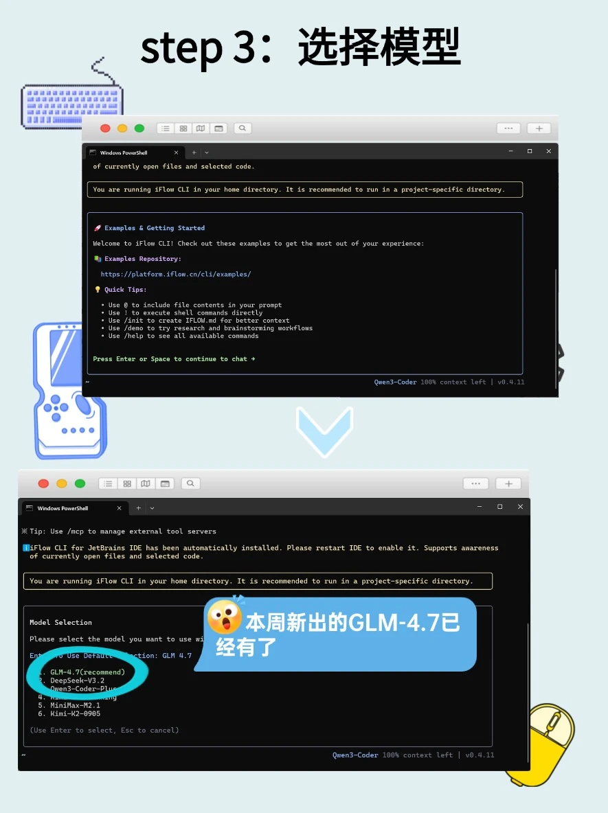 3️⃣模型选择。心流开放平台响应极快,本周刚出的 GLM-4.7 已经能直接调用了。此外还有 Qwen3 Coder、DeepSeek 等顶流模型,自由度很高。