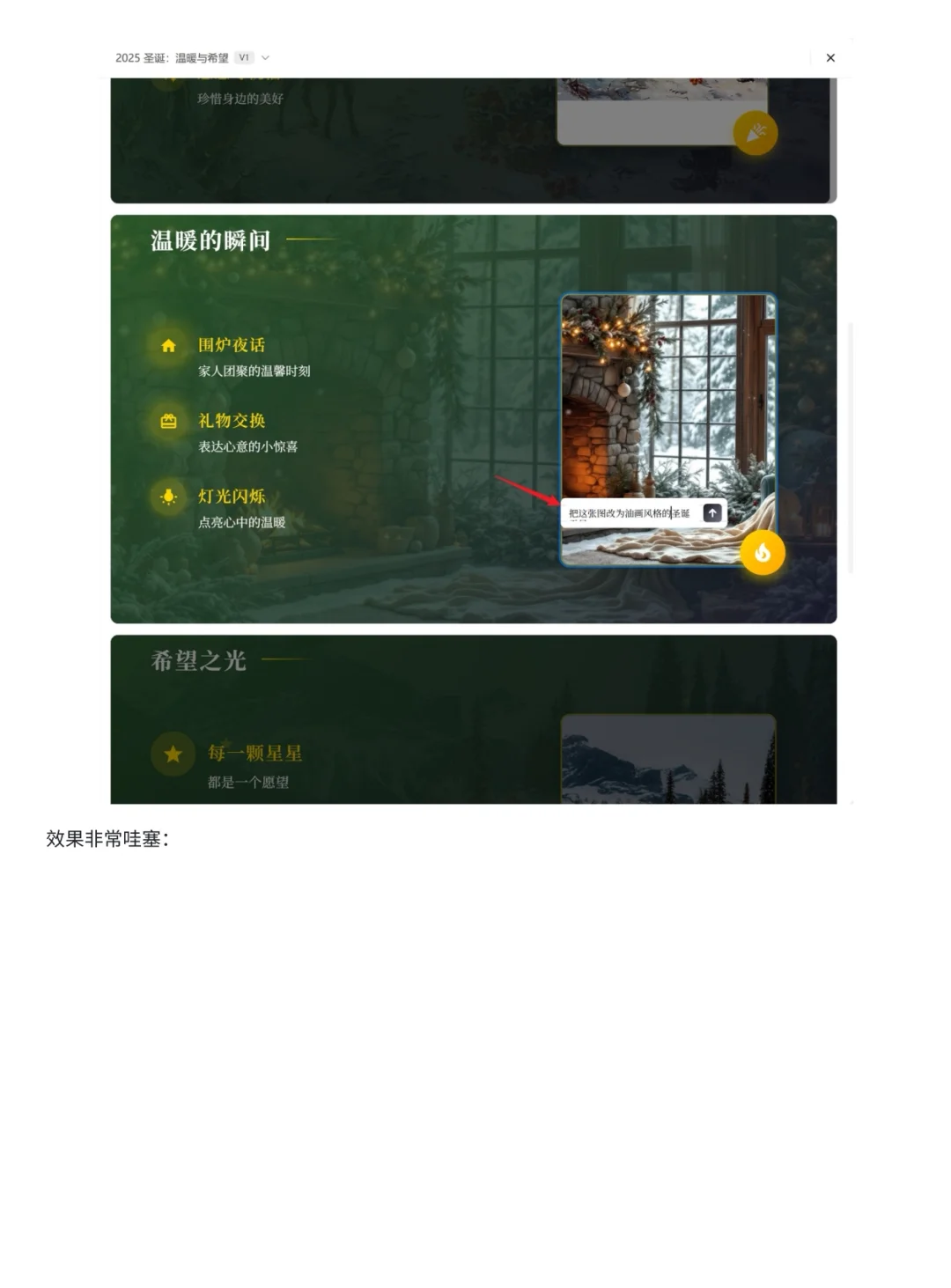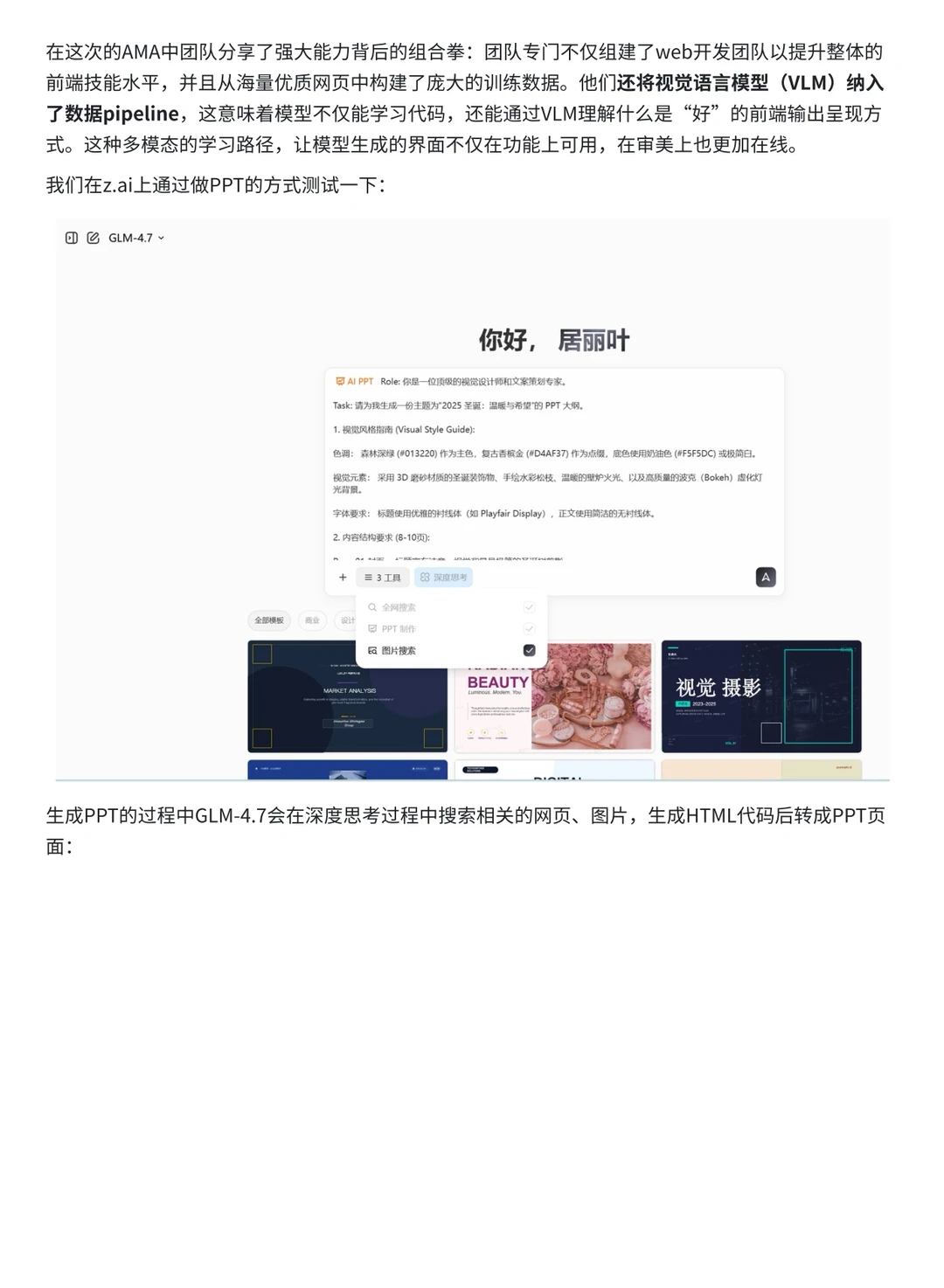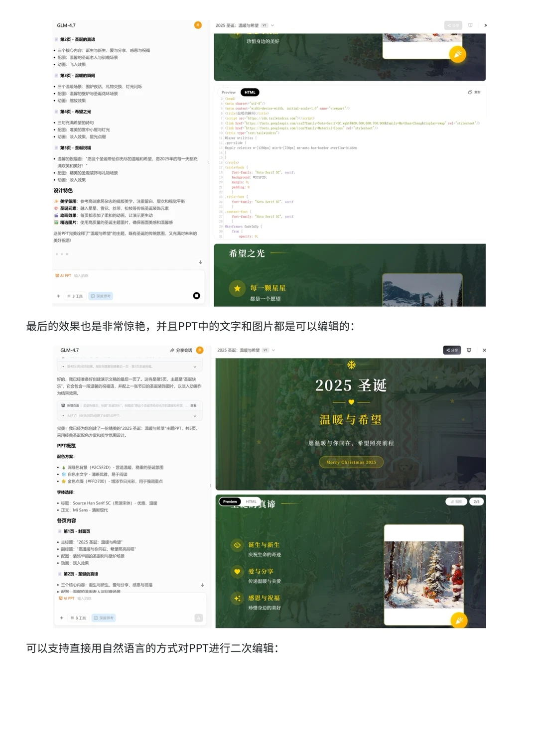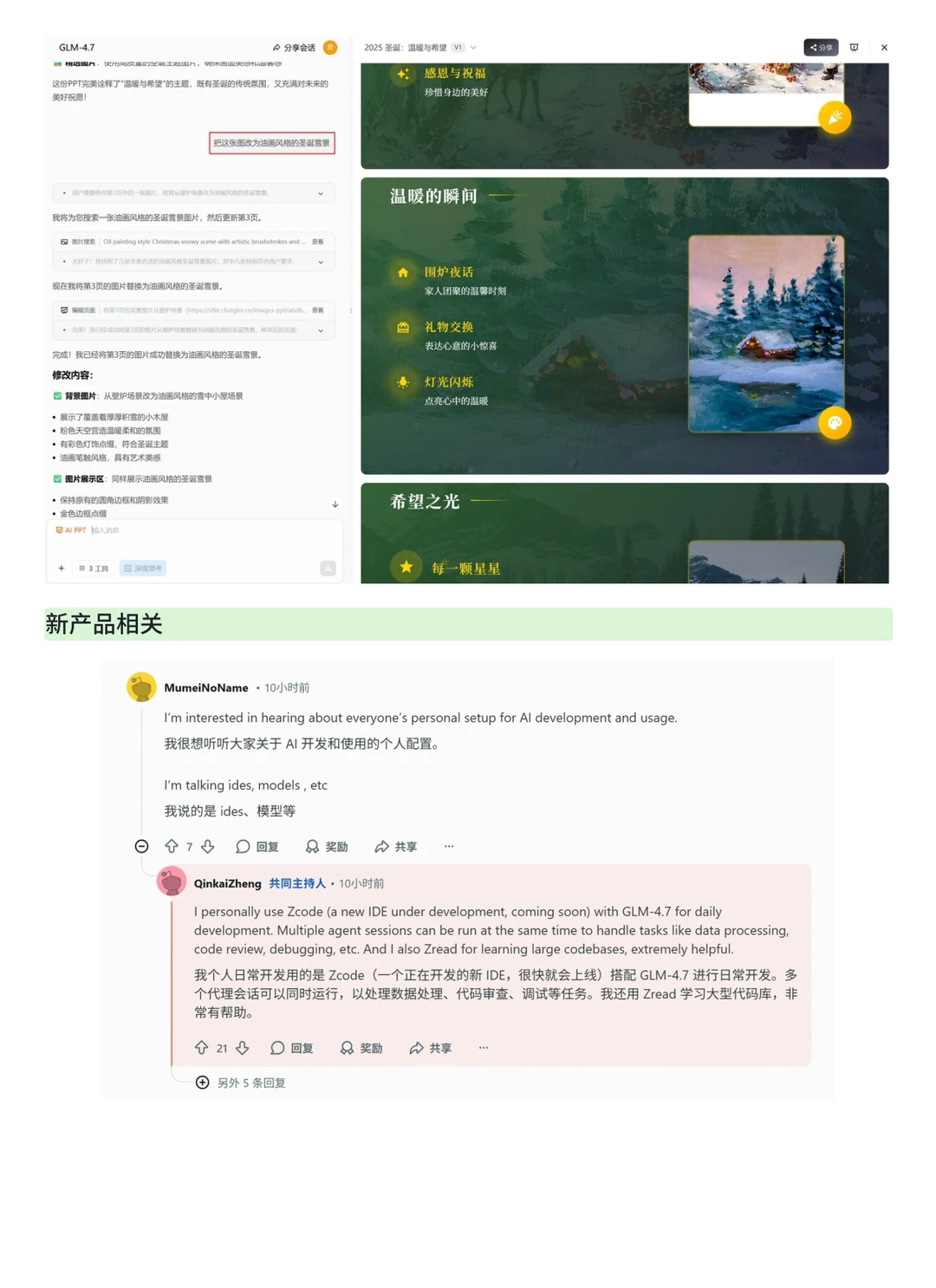 看到AMA中提到了模型强悍的前端能力,今天是平安夜,于是我抱着找茬的心态在 z.ai 上跑了个圣诞主题 PPT ,效果真的有被惊艳到 。可能是因为它在数据pipeline中引入视觉语言模型的逻辑起了奇效,让模型具备了某种审美自觉。哪怕我随口要求将配图改为油画风格,它生成的色彩平衡和视觉重心也都非常在线,这种对美的理解已经超越了单纯的像素堆砌 。