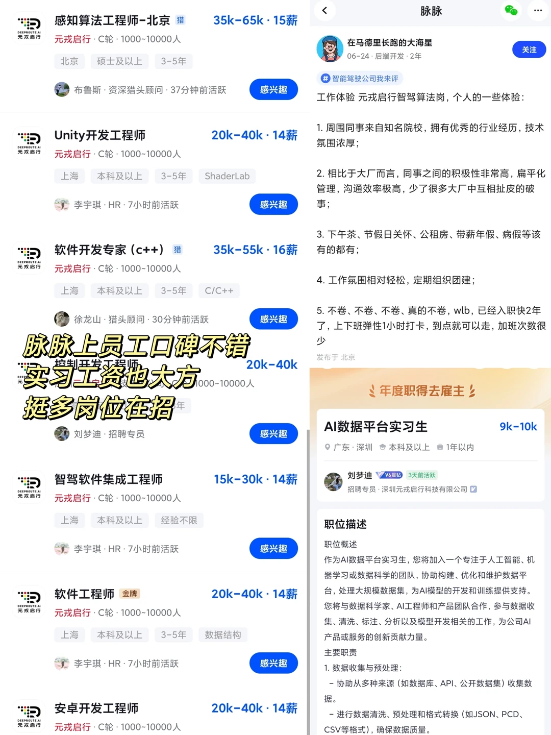 扒了下脉脉上的员工口碑也很不错,薪酬在行业里也属于大方水平,果然是能连续6年拿脉脉「年度职得去雇主」的公司👍 在招岗位里,大模型、VLA 算法、Agent 研发等岗位需求很大,也有实习岗在招,深圳上海都有base,感兴趣的可以去试试~