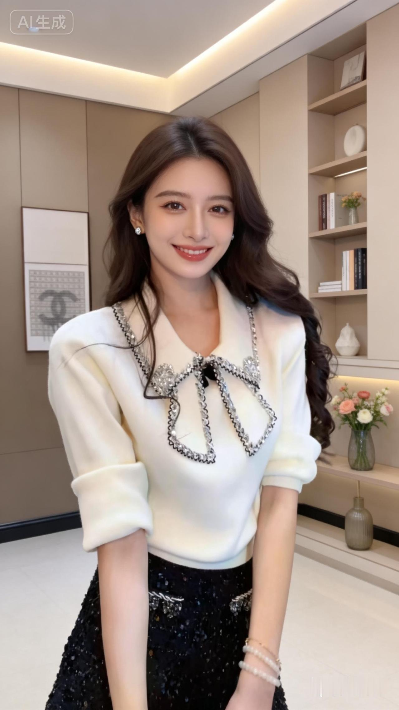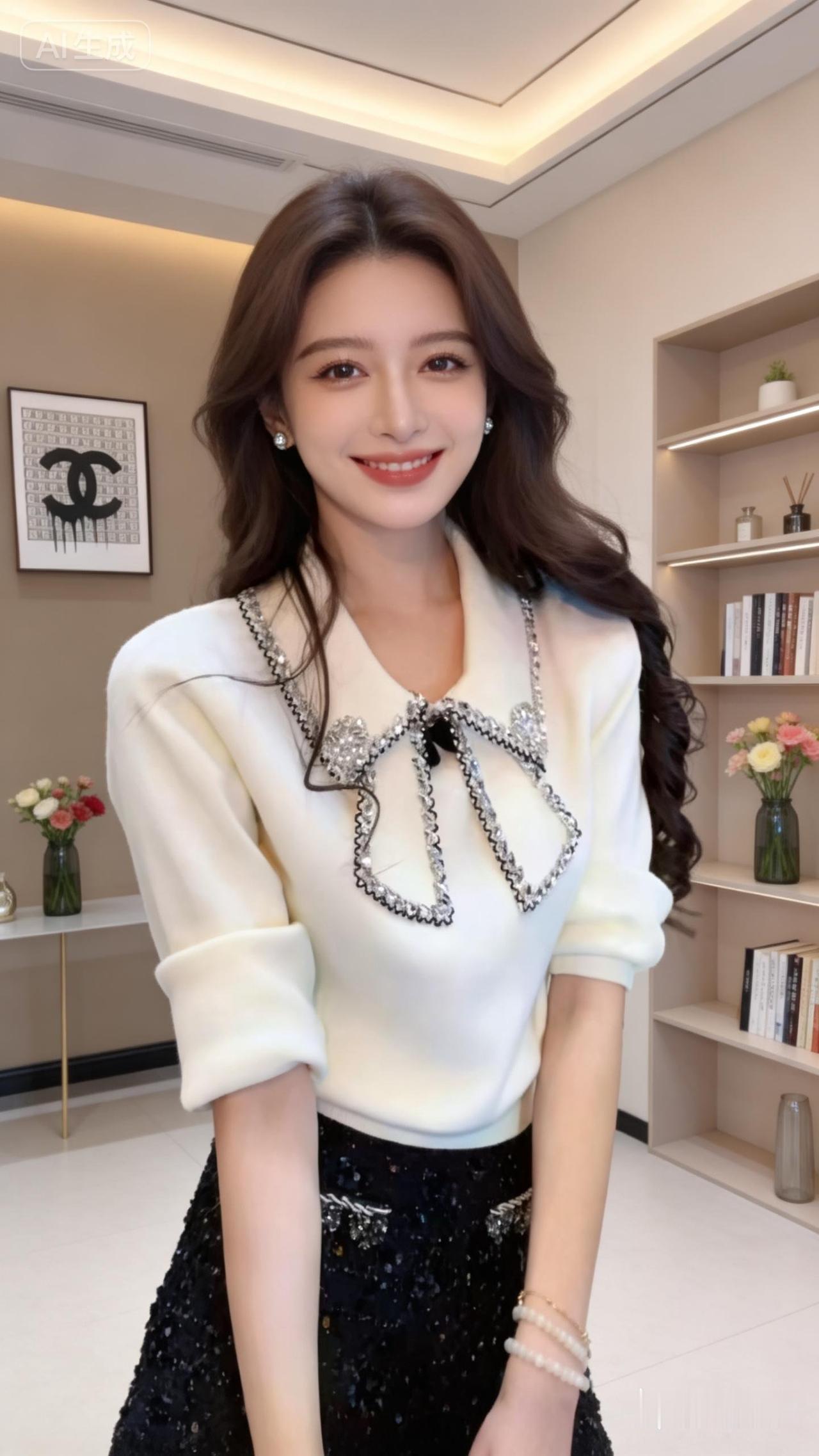 坐在书桌前,手撑着下巴看向前方,蓬松长发滑落肩头,发梢蹭到浅色毛衣。脸上是精致的