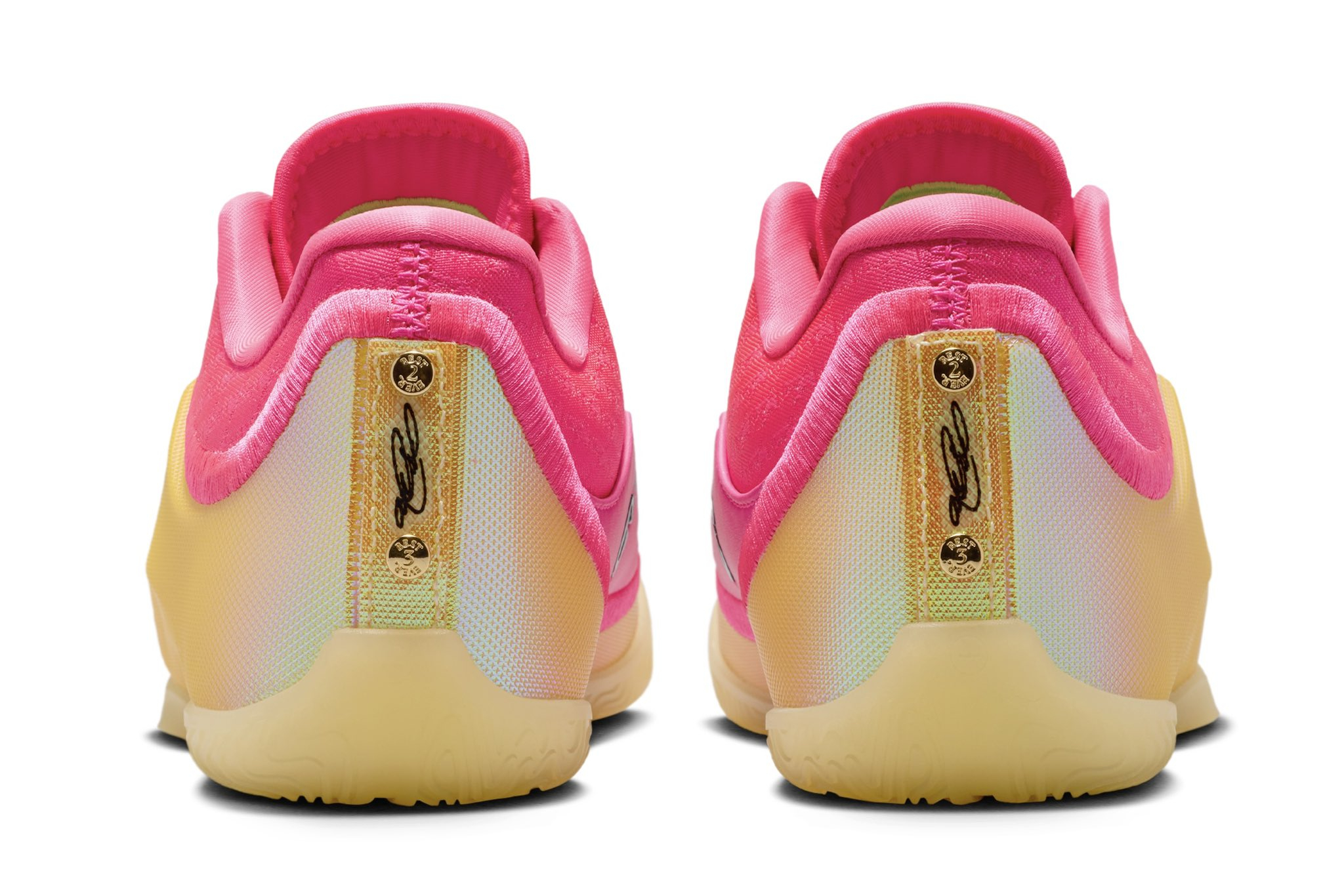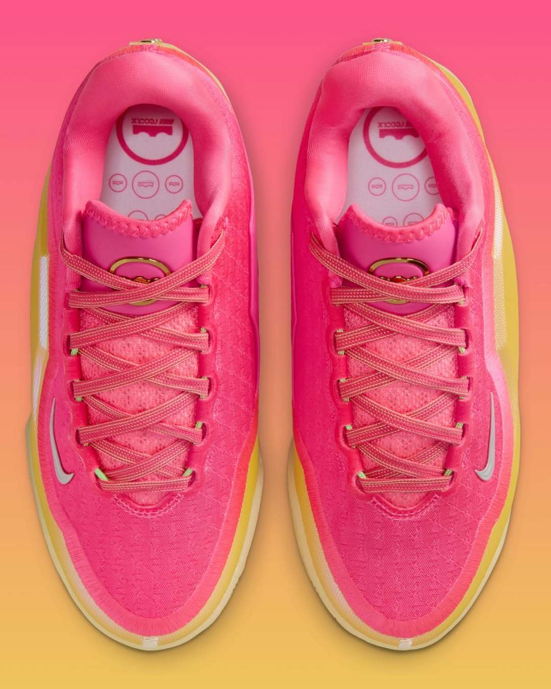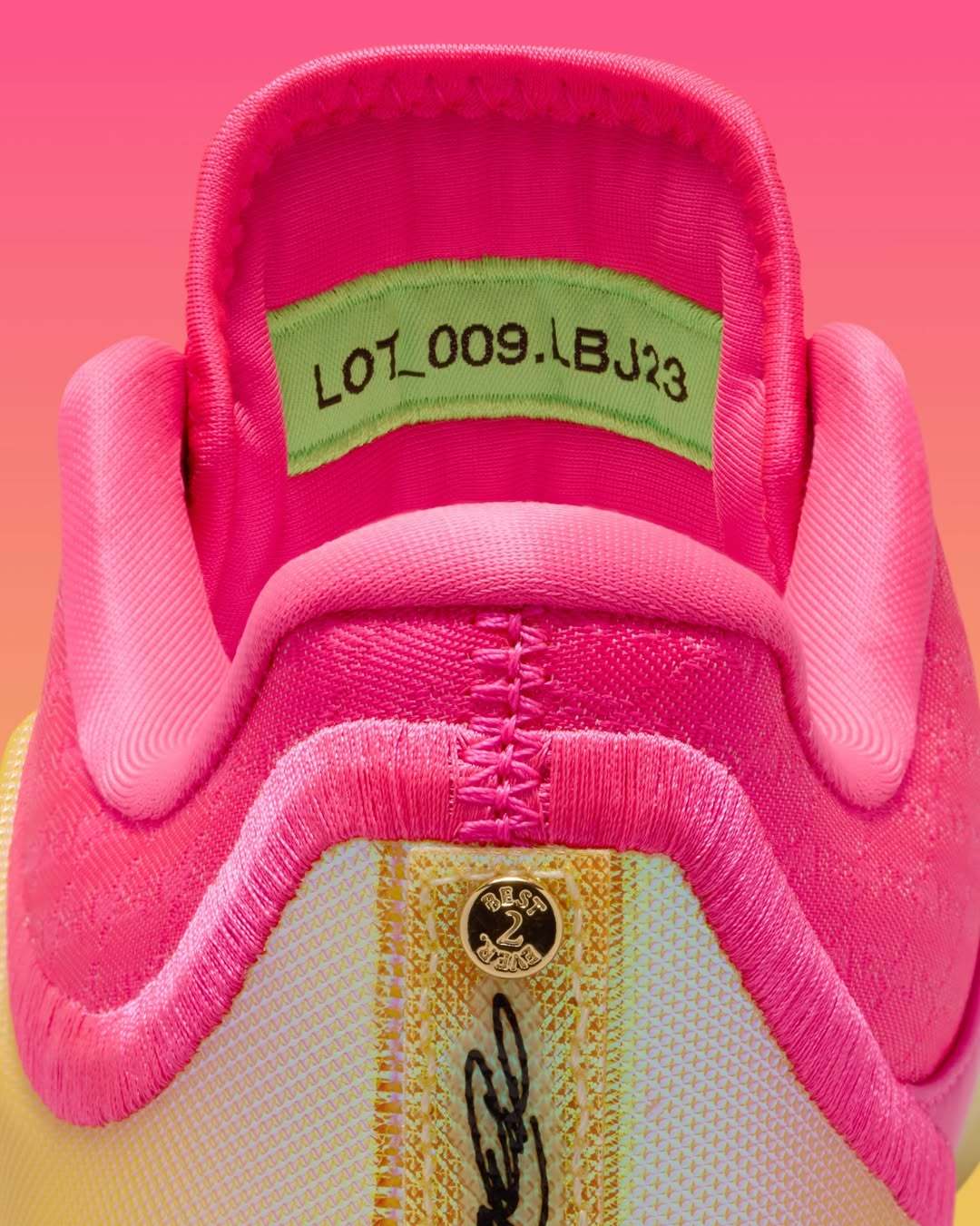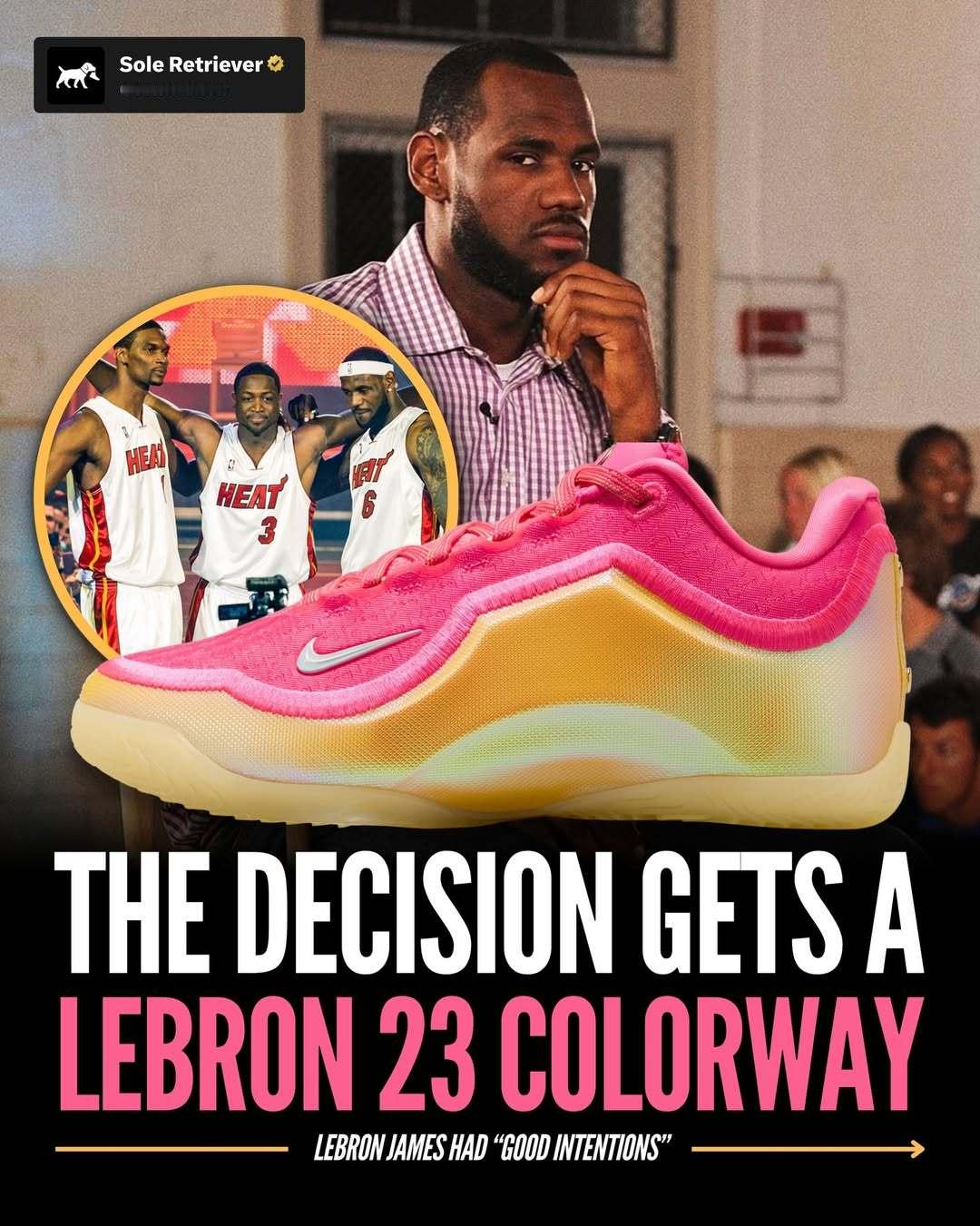 LeBron 23新配色 “Good Intentions”,灵感源自2010年的“决定”,采用分叉皇冠设计,配以金色点缀,并以粉色致敬他当时所穿的红白相间衬衫。