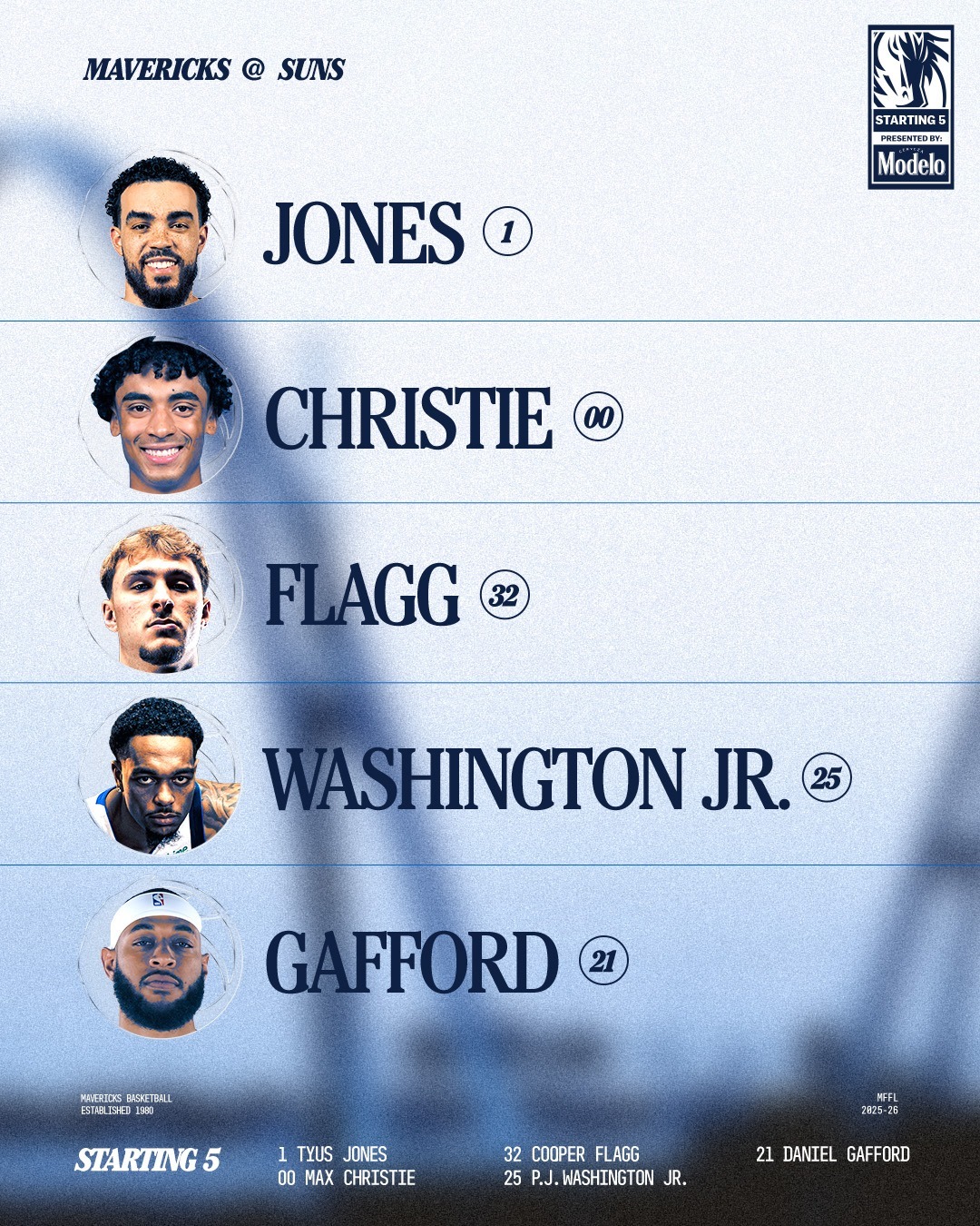 独行侠今日首发:琼斯、弗拉格、克里斯蒂、华盛顿、加福德。