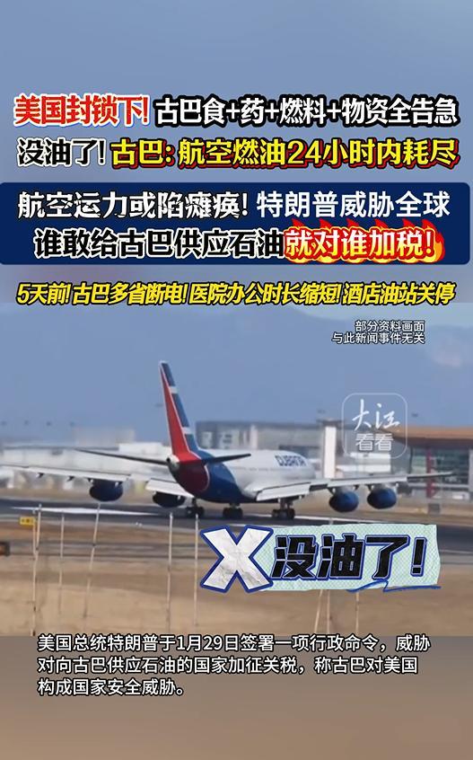 美国对古巴石油封锁,古巴航空燃油告急! 据报道,古巴正面临着由于美国石油封锁而引发的航空燃油短缺危机。古巴政府已向在该国运营的多家国际航空公司发出警告,自2月9日起,航空燃油出现短缺。这一短缺直接威胁到古巴的航空运输能力,可能导致航班运营陷入瘫痪。 美国总统特朗普于1月29日签署行政命令,计划对向古巴供应石油的国家加征关税,理由是古巴对美国国家安全构成威胁。这一举措无疑加剧了古巴本已严峻的经济形势。 古巴目前正处于长达6年的严重经济危机中,经济大幅下滑,通胀高企,食品、药品和燃料等基本物资短缺。美国的石油封锁和关税威胁,无疑让古巴的处境雪上加霜。 古巴正在积极应对这一危机,但燃油短缺对其航空业乃至整体经济的影响不容小觑。国际社会应关注古巴的困境,推动通过对话和合作解决分歧,避免对古巴人民造成更大的伤害。