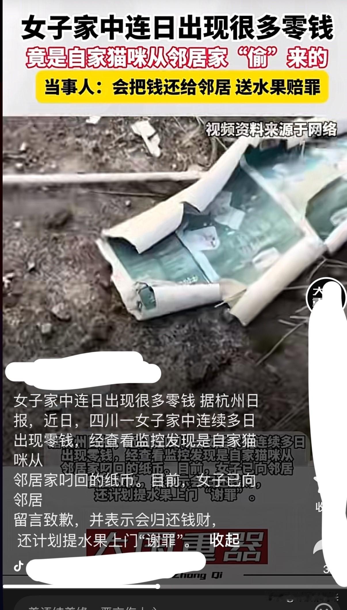 这样的“招财猫”,您怎么看?[捂脸] 近日,成都一女子莫名发现家中连日出现很多零钱!起初真以为是自己进庙焚香祈祷“财神爷”起了作用,所以天降横财!后查监控终于得知:原来这是自家的猫咪从隔壁邻居家叼来的! 虽说这是意外之财,可毕竟也是“不义之财”!世人皆知“不义之财不可取,痴妄之念切勿生”的道理!猫主人三观很正,打算替猫赎罪:不但要把猫咪“偷”回家的总共102.5元巨款还给邻居,还打算送水果赔罪! 不过该说不说,见过猫咪往家叼鱼、叼老鼠、叼玻璃球,甚至还有往家叼衣服的,头回见猫咪往家叼钱的! 不得不说,这是一只“招财猫”!可这样的猫咪却让主人哭笑不得,爱恨交加呀!如您拥有它,您又会如何对待其猫其事,毒打一顿还是多加几块小鱼干?[捂脸]