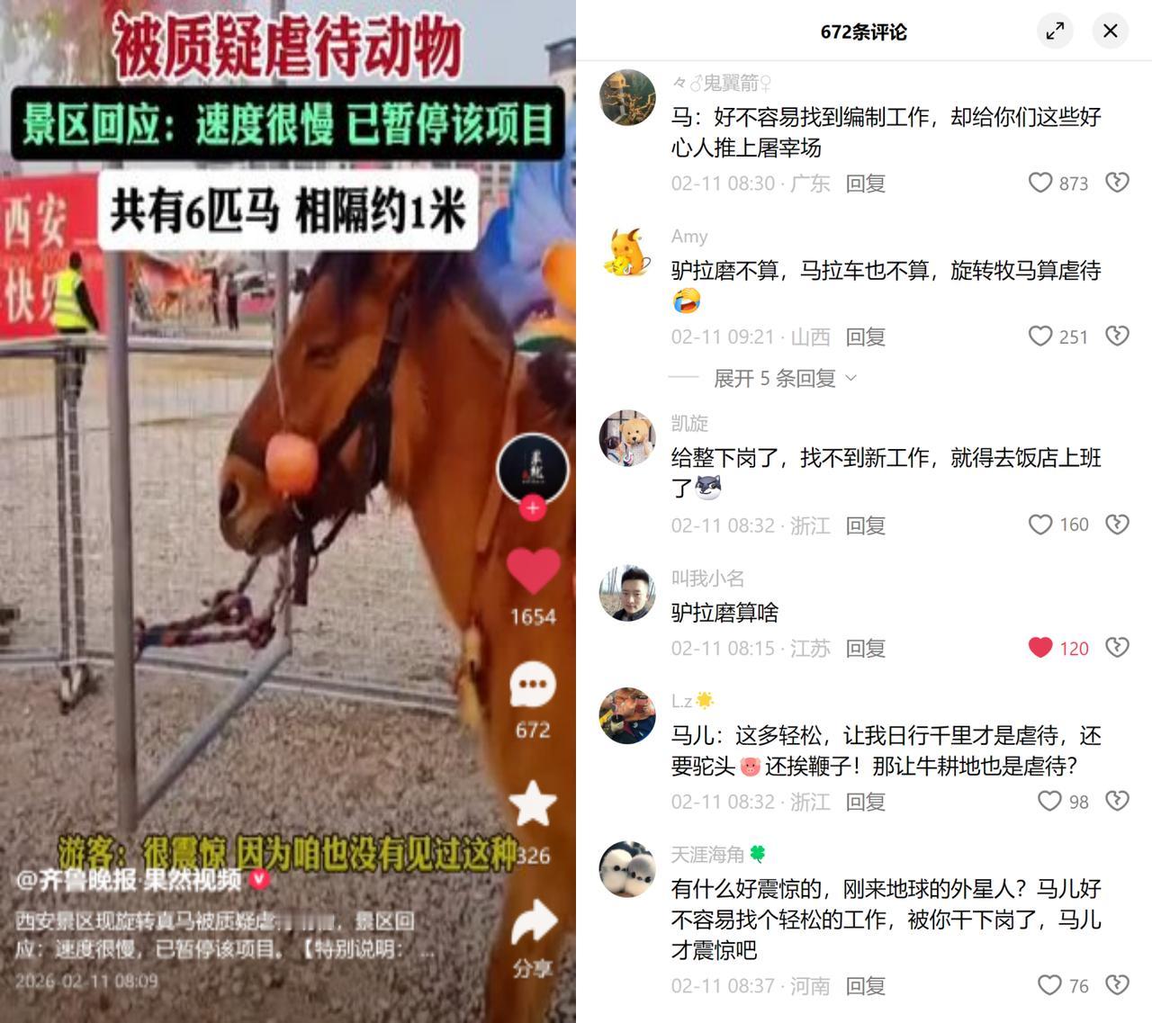 旋转真马被喊停,马要失业了? 西安有景区搞了个旋转真马项目,6匹马慢悠悠转圈圈,没受惊也没遭罪,结果被质疑虐动物,项目直接暂停了。 可现在舆论全反转了,大伙都替马捏把汗:这可是马的轻松编制岗啊! 比起拉车耕地挨鞭子、驮游客跑断腿,天天慢悠悠转圈圈,简直是马生巅峰。那些喊着保护动物的爱心人士,咋就没想想,项目停了,马没了经济价值,搞不好真要被送屠宰场? 不少打工人看了更扎心:我一天在厂里转十几个小时咋没人管?这活我都羡慕,马招谁惹谁了! 合着爱心只分给动物,看不见底层人天天重复劳动的旋转人生?这根本不算动物保护,就是种道德傲慢,你眼里的虐待,可能是别人(别马)求之不得的生存机会啊! 要是马能开口说话,你猜它会选继续转圈圈,还是去干累死累活的苦力活?