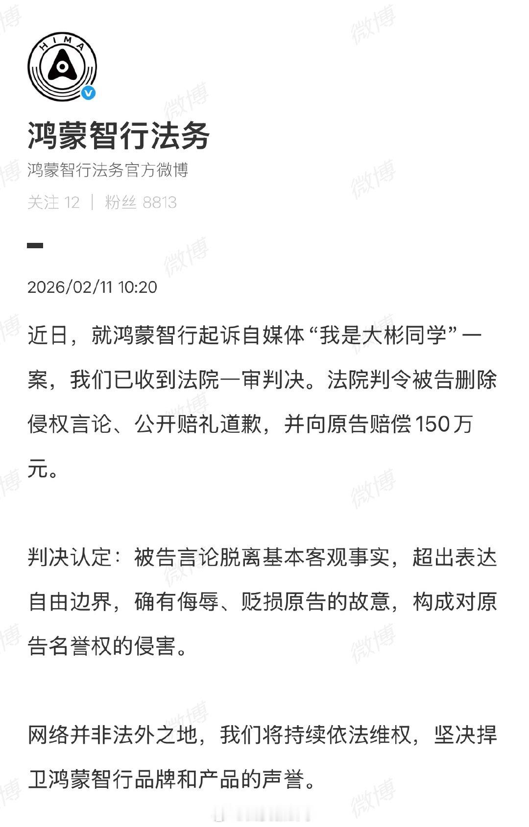 【鸿蒙智行法务公布诉我是大彬同学案结果】我是大彬同学被判向鸿蒙智行赔偿150万 2月11日,公布诉“我是大彬同学”案结果。
