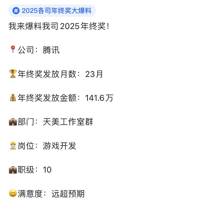 知道游戏行业挣钱,但没想到钱这么好挣,一位网友爆料,坐标天美工作室,岗位是游戏开发,2025年年终奖发放了23个月,到手金额141.6万。