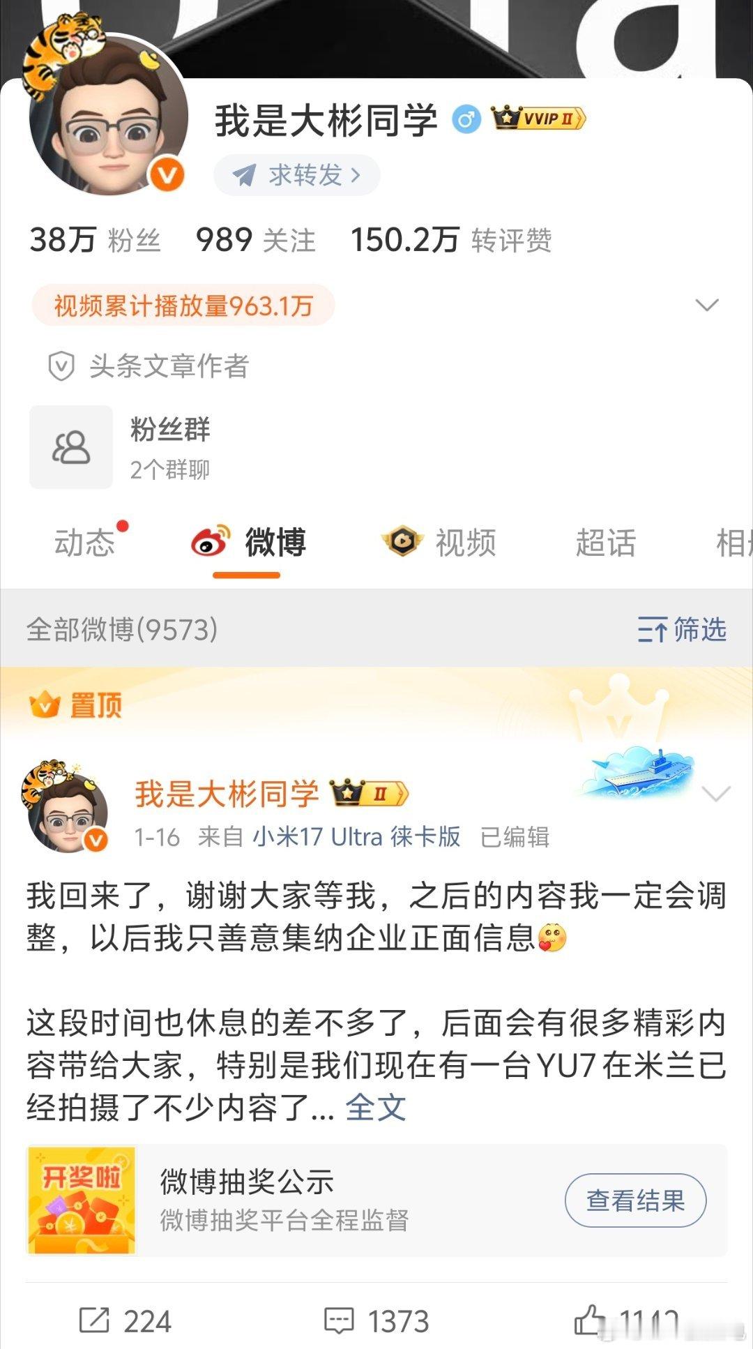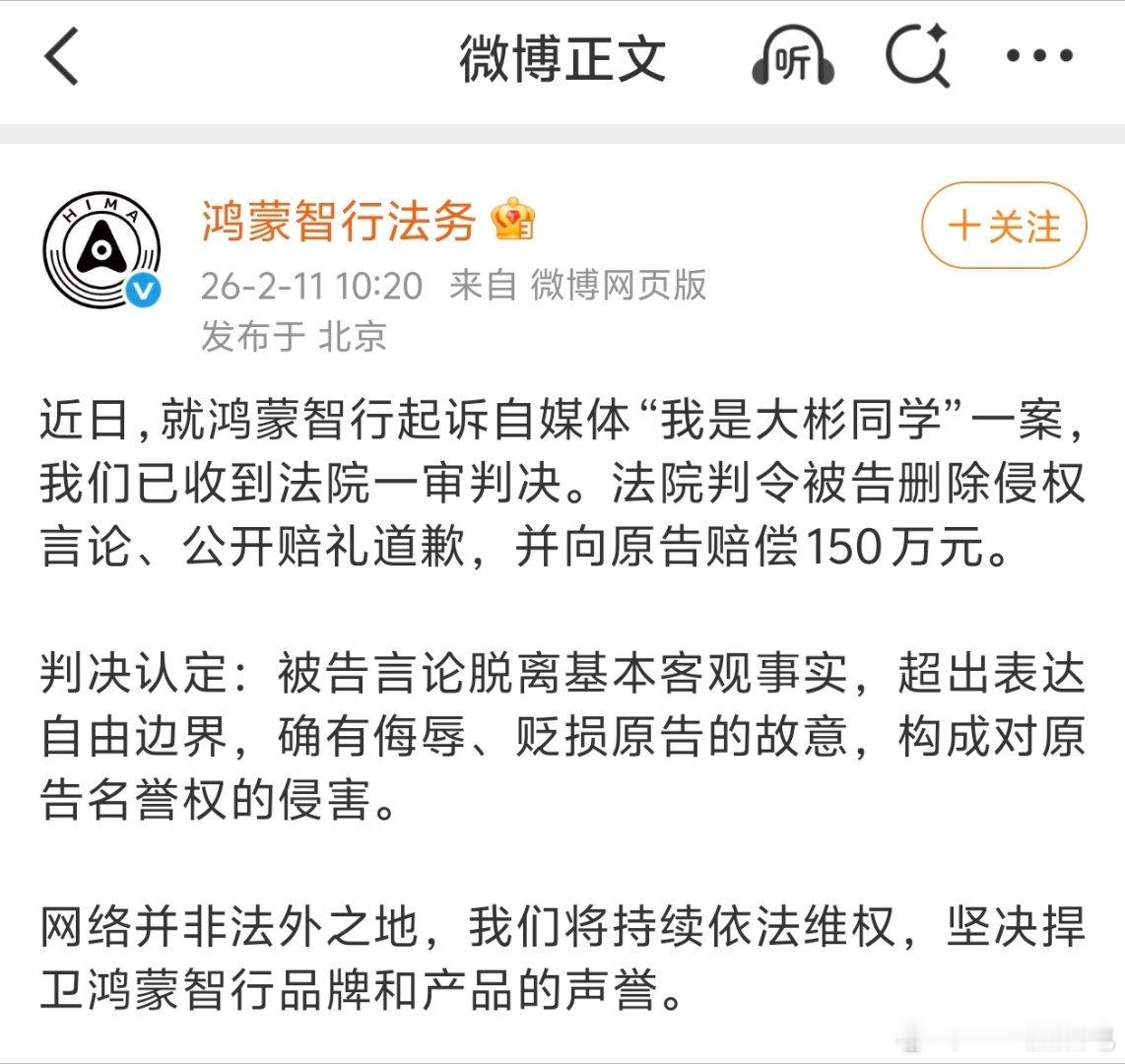 嚯150万赔偿。看他微博,刚解封还没开心几天,就收到一审判决,公开道歉也还没发,会继续上诉吗?封完号后“只善意集合纳企业正面信息”,晚了点咯大v聊车鸿蒙智行华为