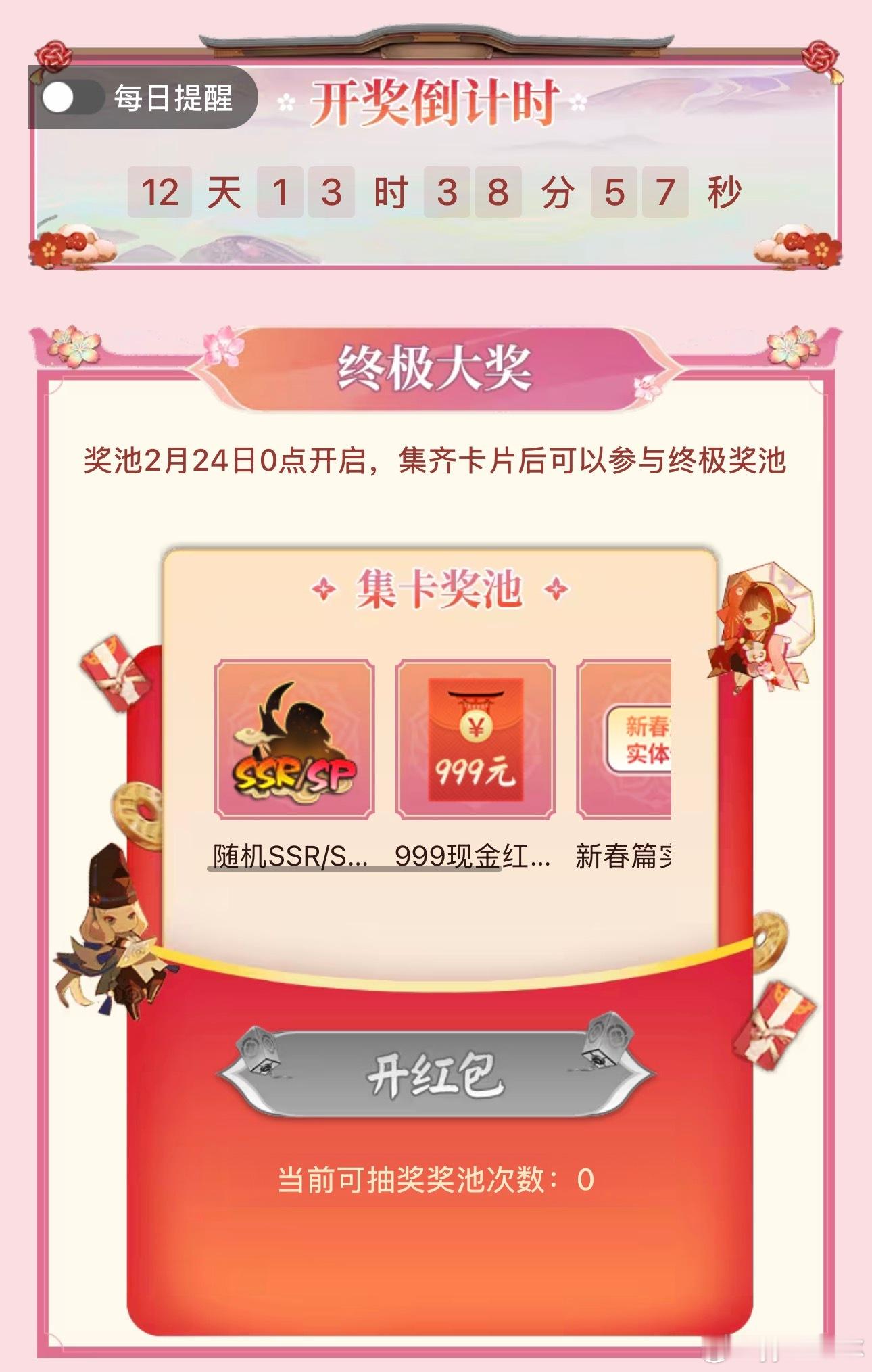 阴阳师手游阴阳师阴阳师新春集卡 【阴阳师·新春集卡】玩法+奖励+抽奖■关+评给大家抽1个花合战+15枚阴阳师徽章■集卡奖励相关①必得:樱饼、体力、勾玉、SSR/SP式神自选碎片(5片)、黑蛋碎片②抽卡概率得:每抽5次卡有一次福利奖池抽奖机会(图四)可以抽新春双式神、新春限定微信红包封面、黑碎、SSR/SP式神自选碎片等③集齐10张卡片:可以在2月24日0点参与终极奖池大奖抽取(图五)能抽999现金红包、新春集卡实体卡一套,随机SSR/SP式神等奖励