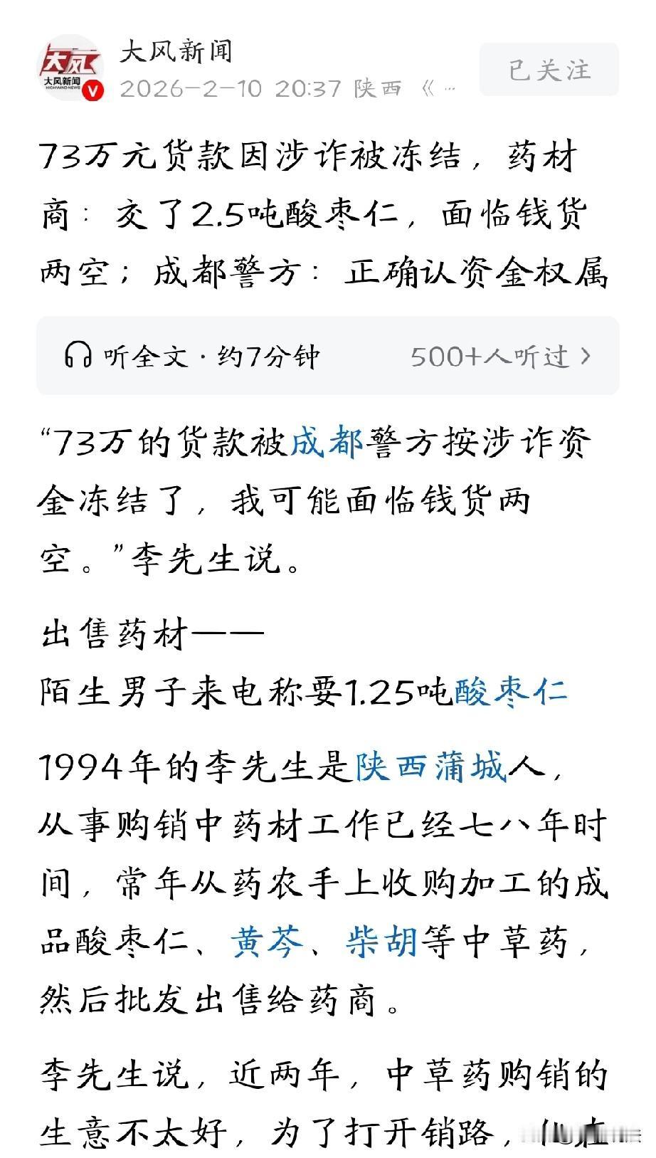 陕西渭南,男子从事中药材购销工作,有个大客户要购买2.5吨酸枣仁,他喜出望外,不仅交付了自己库存的1.25吨酸枣仁,还从朋友那里购买了1.31吨酸枣仁,一共收到73万货款。不料,第二天去收购药材时,他的账户竟然被外地警方冻结,货款也成了涉诈资金,面临钱货两空的境地。男子主动给警方说清他正常交易的事实,希望能解冻这边货款,谁知,警方的说法让他更加无语。 男子李先生是陕西蒲城人,今年32岁,从事了七八年中药材购销生意,平时主要从药农手里收酸枣仁、柴胡等常见的中药材,再转手批发给其他药商赚取差价。 这两年药材生意不好做,为了多找点销路,他就在网络平台发视频推广自己,还留下了自己的联系方式,希望能多接点订单。 2025年12月13日下午,李先生接到一个电话,对方自称是河南商丘的,是一家药厂的合伙人,通过网络平台看到了李先生的信息,想要采购1.25吨酸枣仁。 李先生一听有大订单,心里挺高兴,赶紧加了对方微信。 为了能笼络住这个大客户,他主动给对方发了药材的视频和样品。对方看了觉得质量没问题,双方谈好价格,按照每公斤280元的市场价成交,还约定好货到付款。 看着对方很专业,价格也算公道,李先生也并没有起疑心,只想着尽快完成这笔大订单。 为了这笔生意,李先生12月14日一早就联系了货拉拉,亲自跟着车从蒲城出发,赶往河南商丘虞城县。 当晚七点,双方见面验货,买家确认药材没问题,就开始卸货。在正式卸货之前,对方先给李先生转了30万元货款。 对方这么讲究,李先生悬着的心也放了下来,心里还暗自盘算这次能小赚一笔,刚好过年花销。 可没过多久,意外发生了。 同一账户又给李先生转了50万元,一下子多转了一大笔钱,对方马上打电话过来,说货款打错了,还顺势提出,让李先生再卖1.31吨酸枣仁给他。 李先生家里现货不够,想着多做一笔生意也好,就赶紧从安徽亳州的朋友那里调货,价格定在每公斤290元。 对于酸枣仁价格提高10元,对方二话不说就同意了,但提出让李先生给他们财务账户退款10万元。为表诚意,对方又陆续给李先生转了2000元定金和2.9万元货款。 面对这一操作,李先生并没多想,当晚就把10万元退给了对方指定的账户。 12月16日,安徽的朋友也通过货拉拉,把1.31吨酸枣仁发到了河南商丘。 李先生看着两批货都顺利送走,钱也收得差不多,以为这笔生意就圆满结束了,心里还盘算着后续能不能和对方长期合作。 万万没想到的是,第二天,李先生去山西收购药材,准备给客户转货款的时候,突然发现自己的两张银行卡全都用不了了。 一查才知道,他的账户被冻结了,这次交易收到的73万多元货款,一分都动不了。 李先生当时就慌了,赶紧去银行打听,原来,他的账户是被成都警方冻结的,理由是账户里的资金涉及诈骗。 李先生越想越不对劲,回头翻看聊天记录才发现,12月15日晚上他给对方退10万元的时候,微信已经多次弹出安全提醒,提示对方账户安全性未知,让他咨询微信反诈助手。 可当时李先生一门心思想着顺利完成交易,和对方建立长期合作,根本没把反诈提醒放在心上,甚至还提出想和对方见面,也被对方拒绝了。 更让他无奈的是,两位货拉拉司机都能证明,李先生发的是实实在在的货物,车子载重1.5吨,车轮都被压得变形,绝对不是空单。 安徽亳州的朋友也证实,李先生确实从他这里买走了1.31吨酸枣仁,这就是一场正常的药材交易。 但警方表示,这起案件涉案金额接近80万元,数额巨大,资金到底属于受骗者还是合法货款,权属还没有查清,必须慎重处理,在调查清楚之前,不能随意解冻资金。 这笔钱被冻结,对李先生的打击非常大。 他身上背着上百万的债务,还要给工人发工资、给药农结账,一旦这笔钱拿不回来,供应商会起诉他,农民工也会找他讨薪,家里人急得都住了院。 更让他无助的是,事情发生后,两地警方出现了管辖争议。 成都警方让李先生向河南商丘的警方报警,说要先查清资金流向和钱款权属;而河南虞城的警方则表示,钱是被成都警方冻结的,让他去找成都警方处理。 2026年1月底,李先生甚至还接到诈骗人员的电话,对方还想继续找他采购药材。 李先生赶紧把情况反映给成都警方,想要配合抓人,可民警表示事发地在河南,他们暂时管不了,只能把情况上报给网安大队。 截止目前,李先生的账户依然处于冻结状态,当初联系他的买家电话已经停机,他依旧在两地警方之间奔波。 不知道这笔钱什么时候才能有结果,也不知道能不能逃过这一劫。