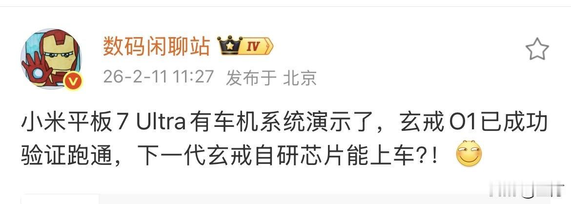 数码博主称:小米玄戒O1已成功验证跑通! 就在刚才,知名数码博主放出了小米玄戒O1芯片最新的消息,现在已经达到了成功验证,并且跑通的阶段! 为了验证这个博主这个话是没有多少问题的,有朋友直接找到了,昨天晚上新闻联播关于这一款的报道,报道当中有三个电子设备,下面的介绍是“多终端智能体,互操作测试版”。 那是不是意味着小米最新的芯片也成了,所以有朋友直接问他,到底是芯片能够上车机,还是搭载玄戒的平板能够上车,正常的逻辑,就是现在这个芯片已经跑通了车机,那么上车也只是差封装了。因为车技已经在7ultra上面演示过了! 不知道在四月份发布他们新产品的时候,会不会会有小米的芯片直接上他们的车机 ,我们拭目以待吧。