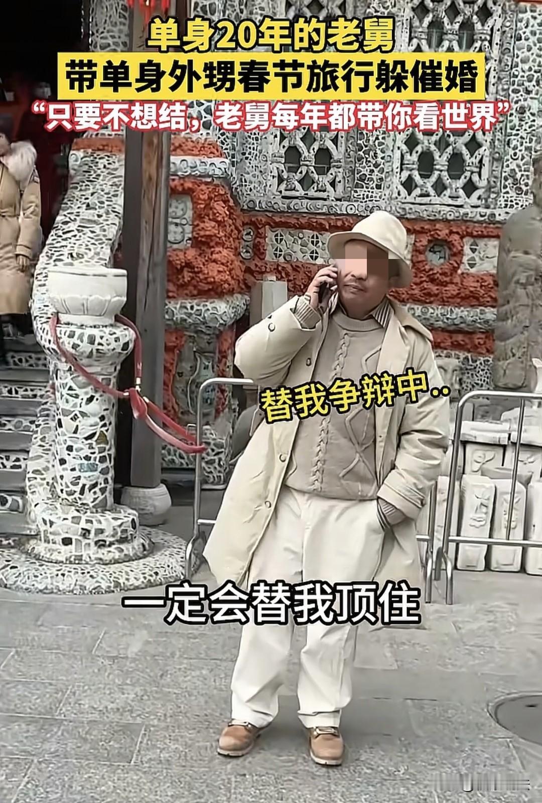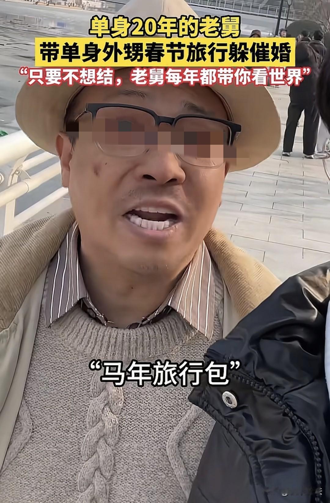 “我也需要这样的老舅!”天津,单身20年的老舅,见外甥过年回家被催婚,忍不了,索性带上外甥去旅游,还送他一个“马年旅行包”,要誓死守护外甥单身的权利。外甥说:外婆和妈妈不懂的道理,舅舅懂。而老舅许下一句承诺,让外甥十分感动。 男子刚毕业,满心欢喜的回家过年,可没想到,迎头赶上妈妈和外婆的疯狂催婚,可给他郁闷坏了。 大过年的回家不就是为了舒舒服服的放松一下,享受家庭团圆的气氛,可长辈一开口催婚,原本美好的心情被破坏,直接变成焦虑了。 男子心情不好就和老舅吐槽,可没想到,老舅做了一个出人意料的决定——走,离开家,去旅游。 原来,男子的老舅已经单身20年了,对于这种逢年必催婚的场面早就脱敏了,也不在乎了,还有一套应对之策,说到底就是惹不起还躲不起嘛。 于是,老舅和外甥收拾行李,整装出发。 两人出来后,男子打开手机记录这不寻常的一刻,他开玩笑说:“我和老舅为了躲避催婚,跑出来流浪了。” 老舅在他身后笑着说了一句:“老舅对着天津之眼发誓,誓死守护你单身的权利。老舅送你一个‘马年旅行包’想去哪就去哪,旅行费我全包了。” 男子一听老舅这么说,心里都乐开花了。 男子感叹道,老舅被催婚了20年,自己刚毕业也被催婚了,压力其实挺大的。 但老舅安慰自己说,“一代人有一代人的活法”。 可是,外婆和妈妈却不懂这些道理,但是,老舅懂,现在老舅有条件了。 如今自己被催婚,老舅出面替自己顶住压力,直接订票带自己出来旅游了。 在路上,老舅还在电话里和男子的外婆、妈妈争辩,帮外甥化解难题。 这让男子很感激,他不再是一个人面对家里催婚孤独无助了,有老舅给他撑腰。 而让他没想到的是,老舅许下一个承诺,只要你不想结婚,老舅每年都带你看世界。 这个承诺让男子十分感动,老舅才是真正懂自己的人。 随后,老舅在网上订了去海南的机票,两个人的,还对外甥说:“让她们催吧”。 男子笑了,此刻,他是真的太爱这个老舅了。 有网友说,我也天天被亲戚催婚,真羡慕你们两能躲起来,无忧无虑的痛痛快快的玩。 什么叫你不想结,只是没有跟自己想结婚得人结婚罢了,人人皆如此。 其实是自己一个人孤独了会去找的,但是一直催着最后和人凑合了,过得不舒服只有自己知道什么感受,这个后果不需要他们来承受。 还有人开玩笑说,小子你被做局了,你老舅找了你这个借口躲催婚! 也有人说,现在男人结婚的意义和代价不成正比,代价太大,回报太少,真不如一个人拿着彩礼钱痛快潇洒,想去哪就去哪,一辈子这么短,谁也不知道自己能活多久。 在这件事里,男子刚毕业就被妈妈和外婆催婚,这其实是对他婚姻自由的一种潜在干涉。 《民法典》第1046条规定,结婚应当男女双方完全自愿,禁止任何一方对另一方加以强迫,禁止任何组织或者个人加以干涉。 每个人都有选择何时结婚、是否结婚的权利,长辈不应以自己的想法去强迫晚辈,否则就违背了法律赋予公民的婚姻自主权。 其实,长辈催婚大多是出于关心,想看着晚辈成家立业,过上安稳日子。 但时代不同了,现在的年轻人有自己的想法和规划,刚毕业可能更想在事业上闯一闯,或者享受单身生活。 就像这男子,满心欢喜回家过年,却被催婚搞得焦虑不已。 而老舅的做法就很暖心,他单身20年,深知被催婚的压力,所以带着外甥去旅游,还在电话里帮外甥争辩,承诺每年带他看世界。这不仅是给外甥撑腰,更是尊重他的选择。 其实,长辈和晚辈之间应该多些理解和沟通。长辈别把自己的意愿强加给晚辈,晚辈也多和长辈说说自己的想法。 婚姻是一辈子的大事,得自己心甘情愿才行。 像老舅这样,用行动支持外甥,缓解了外甥和家里因催婚产生的矛盾,又尊重了晚辈的意愿,大家都能过个好年。 对此你怎么看呢?