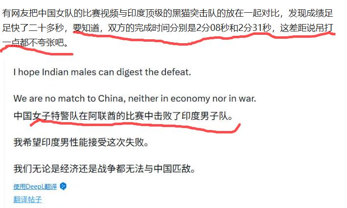 印度黑猫突击队在阿联酋被中国女子特警队吊打。 阿联酋特警挑战赛为啥让印度破防 印度黑猫突击队的大名,我们早有耳闻,就是那个从几百公里外800里加急然后坐公交车去解救人质同时进行电视直播最后人质没有救到还搞死自己几十个人的反恐精英嘛。 他们被吊打不是理所当然的吗? 不说他们,就是北美懦夫一样被吊打。 目前我们有两支女队参赛。 一支是大名鼎鼎如雷贯耳名扬天下打遍天下无敌的川~~~妹~~~子:四川女子特警队。目前排名14。她们击败了全世界绝大多数的男子特警队。 另一支则是神秘低调简单高效一击必中的国家忠诚卫士特~~~勤~~~局:公安部特勤局女卫士大队。目前排名38.。她们同样击败了全世界60%的男子特警队。 所以印度人也不要什么破防了。 要认清自己的位置,习惯就好。 点右上角关注我,我们一起去看这个魔幻的世界