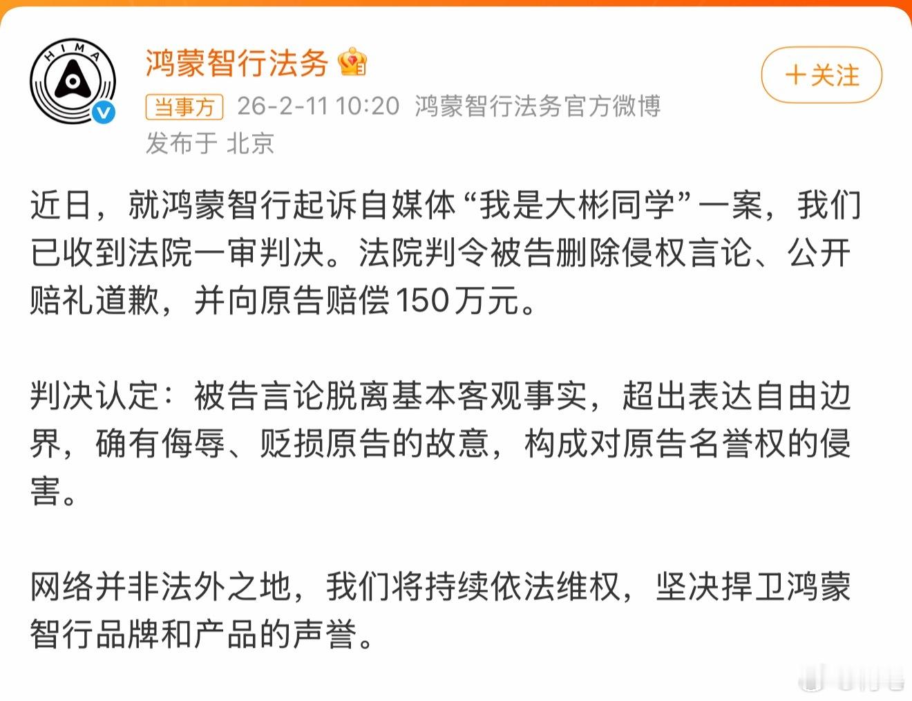 我是大彬同学被判赔鸿蒙智行150万