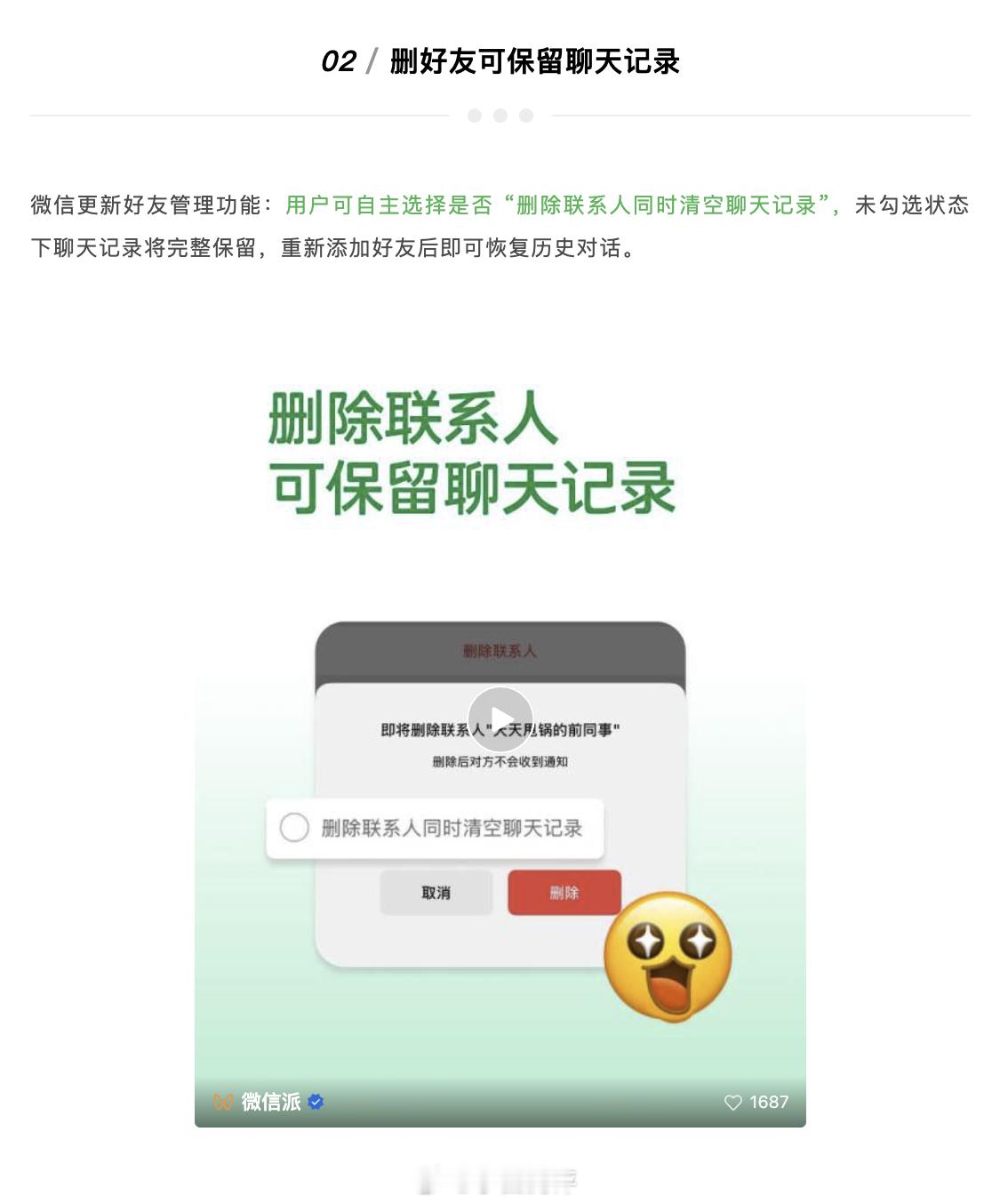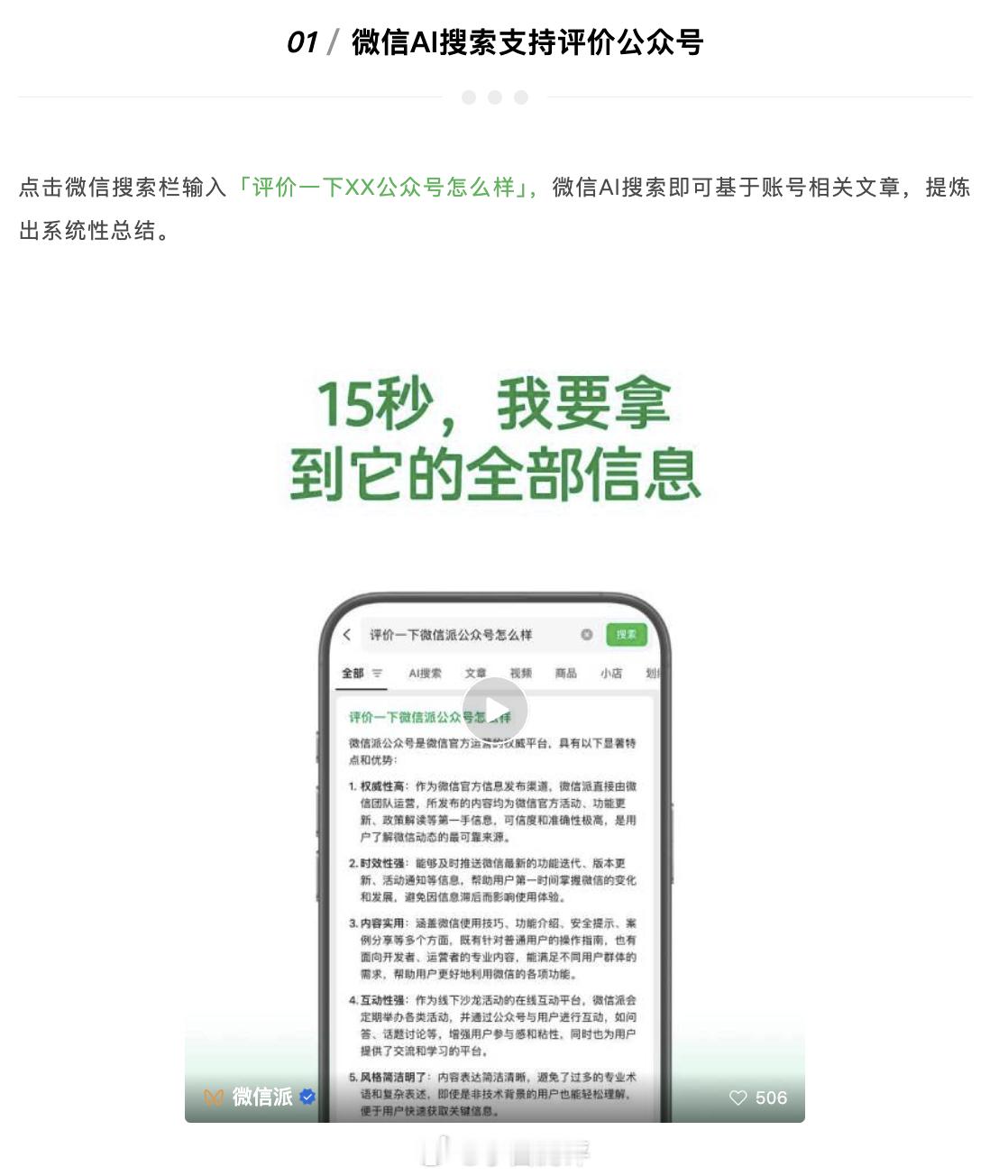 微信9大更新 微信公开课总结的微信1月份9大更新,比较实用的就前两个,后面基本都是给创作者、商户和游戏玩家的,你还希望更新啥功能?1️⃣微信AI搜索支持评价公众号2️⃣删好友可保留聊天记录3️⃣视频号原生短剧激励计划上线4️⃣视频号可自定义商品出现时机5️⃣微信小店可快速投诉假冒商品6️⃣AI小程序成长计划上线7️⃣小游戏直播预约有流量激励8️⃣小游戏全新升级商业化工具箱9️⃣小游戏擂台赛组件上线
