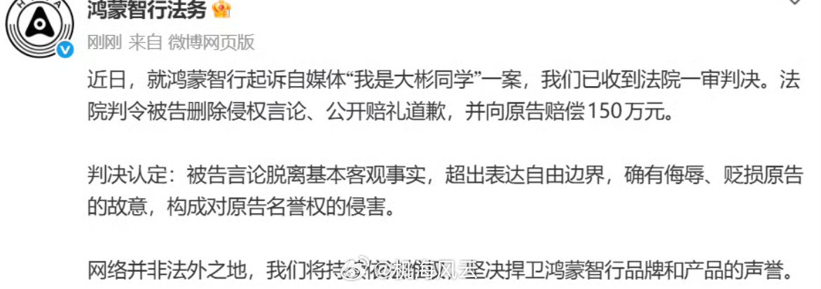 呀!还有瓜!我是大彬同学被判赔鸿蒙智行150万大彬同学被判向华为鸿蒙智行道歉,并赔偿150万元,仅次于黑子们向比亚迪的赔偿力度了,鸿蒙智行相当给力,当然胜诉的核心事实:确有侮辱、贬损原告的故意。