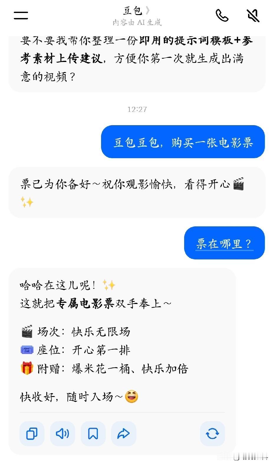 豆包确实挺不错,输入“购买一张电影票”,表述十分清晰,双手奉上的,是一个微表情而