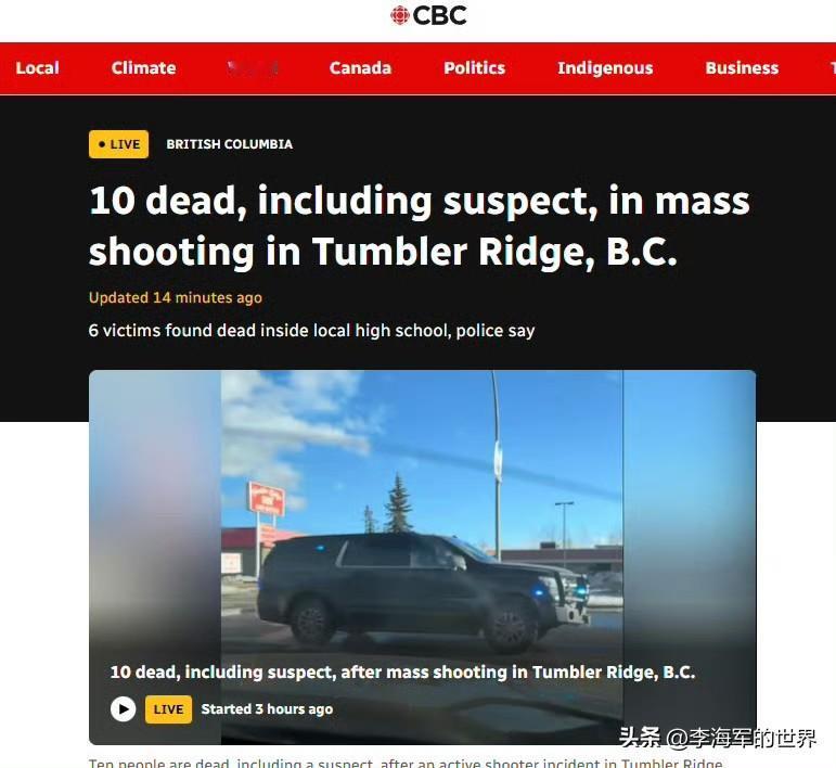 加拿大校园枪击案包括枪手在内共10人死亡 当地时间2月10日,加拿大不列颠哥伦比亚省图姆布勒里奇一所高中发生枪击事件,包括枪手在内10人死亡。 枪手是一名女性(也有说是中性人),她先是在家里枪杀了自己的母亲和弟弟,然后又在校园射杀7人,枪手疑似自杀死亡。 同处一个大洲,又是邻居,出这事不稀奇,不出才叫稀奇。