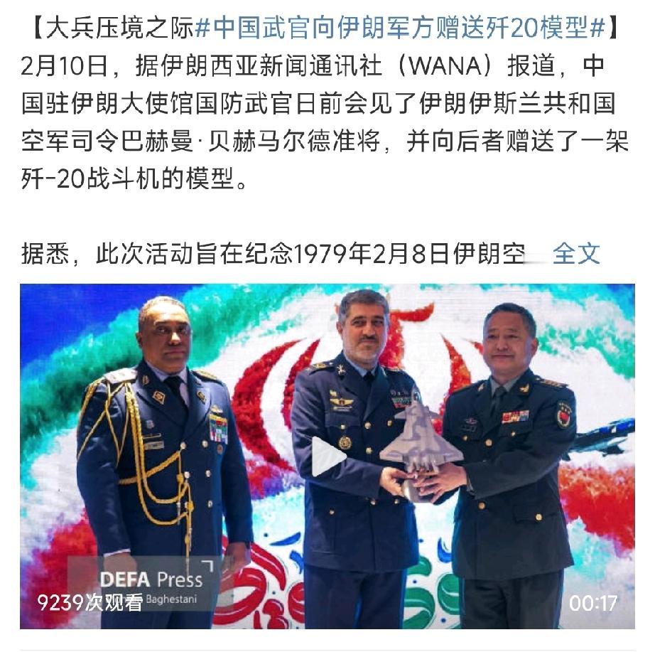 神操作: 一个“玩具”就把美军打发了…… 此次美伊危机期间: 中国表现的温和理性,只是与绍伊古会了个面,只是收到一份伊朗送来的信函而已。 结果,就在美国航母编队依然畅游阿拉伯海之际,美伊危机就这样暂缓了…… 没想到的是2月10日,中方又向伊朗赠送了一个玩具——歼20模型: 于是,美伊危机中最具戏剧性的一个画面就这样出现了。