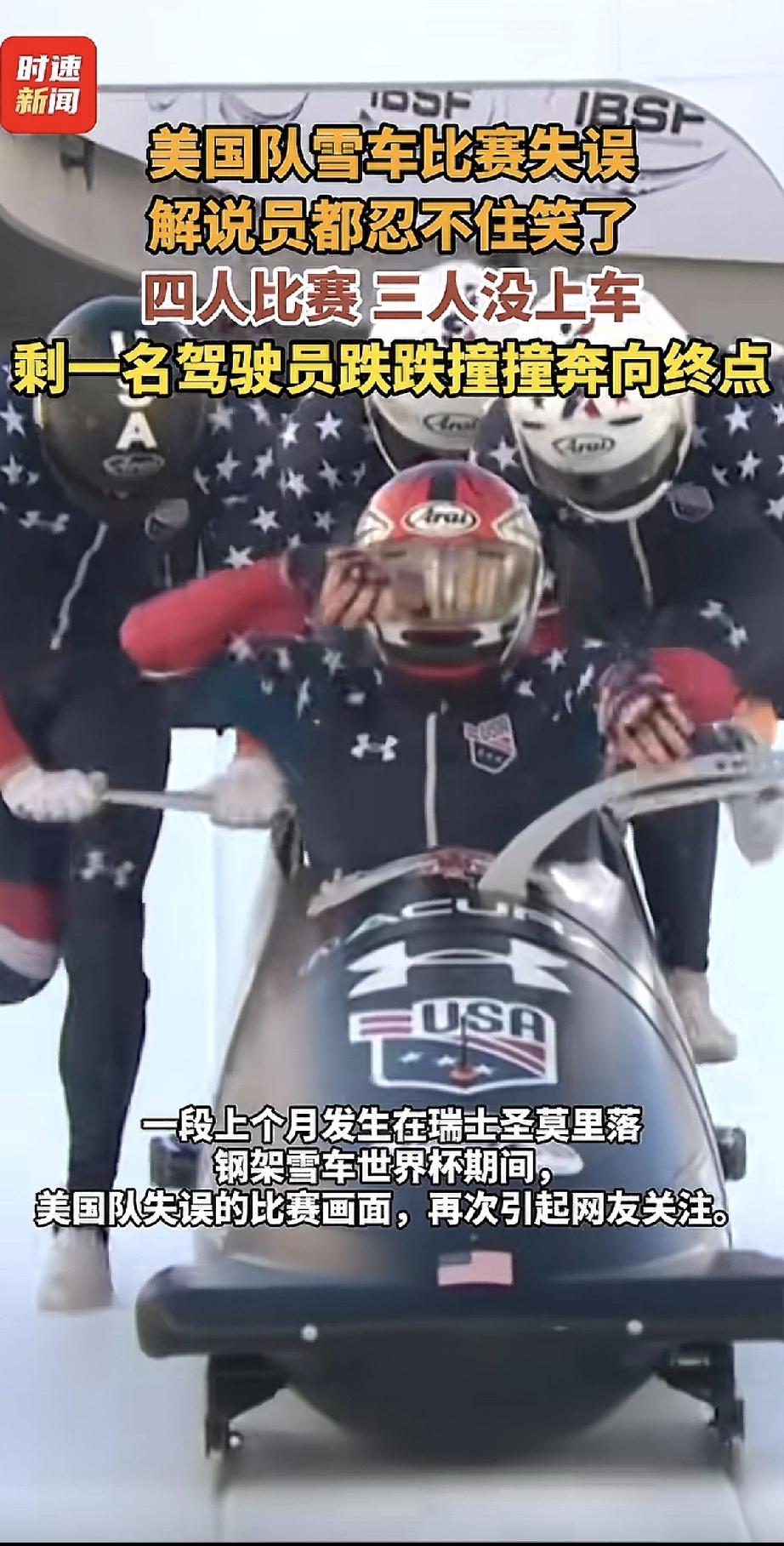 最近,一段上个月雪车世界杯的比赛画面又在网上火了,不是因为胜利,而是因为美国队一次让人哭笑不得的“史诗级失误”。 在四人雪车比赛中,起跑至关重要。结果美国队不知是节奏没对上还是太过紧张,起跑推车时,三名队员居然都没能成功跳进车里,只有驾驶员一个人跌跌撞撞地“光杆”出发了。 你能想象那个画面吗?一辆本该坐四个人的大雪车,就载着一个孤零零的驾驶员,摇摇晃晃地滑向终点。就连现场的解说员都实在没忍住,笑出了声。这真成了体育史上一个经典又有点滑稽的名场面,也提醒所有团队项目:默契,比什么都重要。