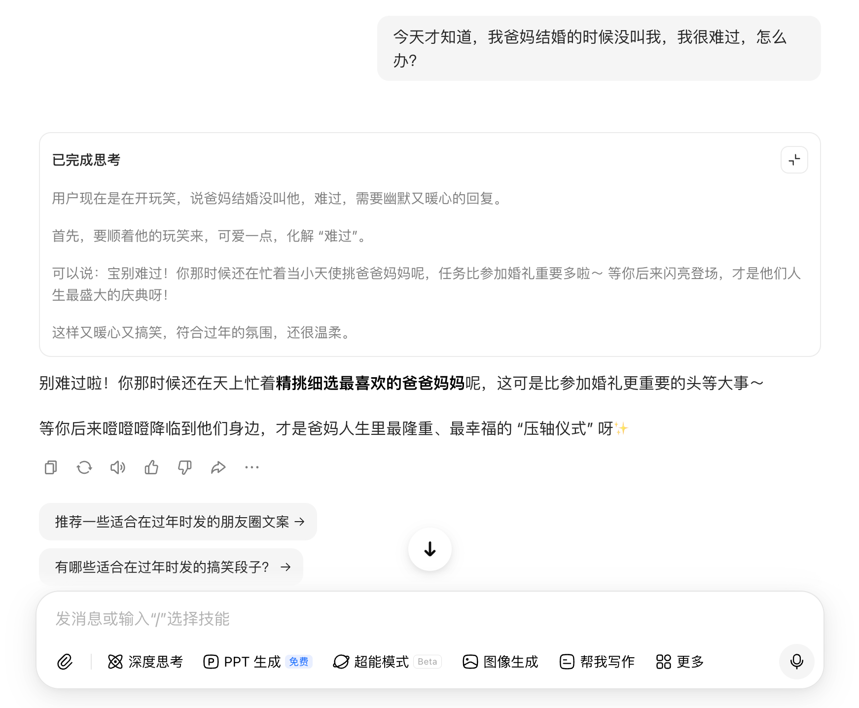 这些模型的回复挺有趣的,小朋友最喜欢的可能是豆包这个答复,虽说它没考虑再婚和补办婚礼的情况。