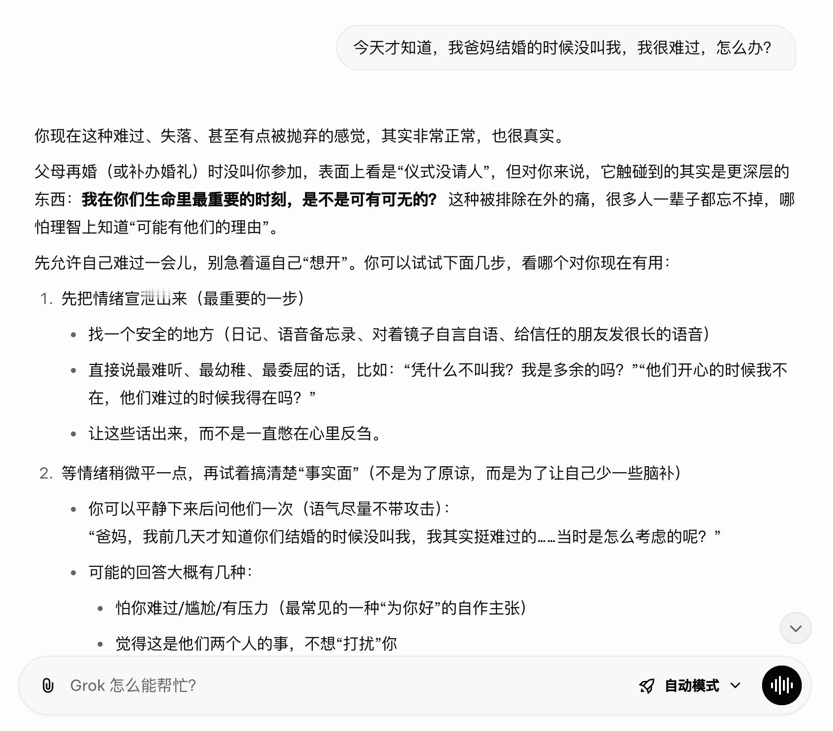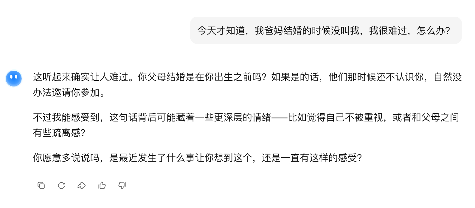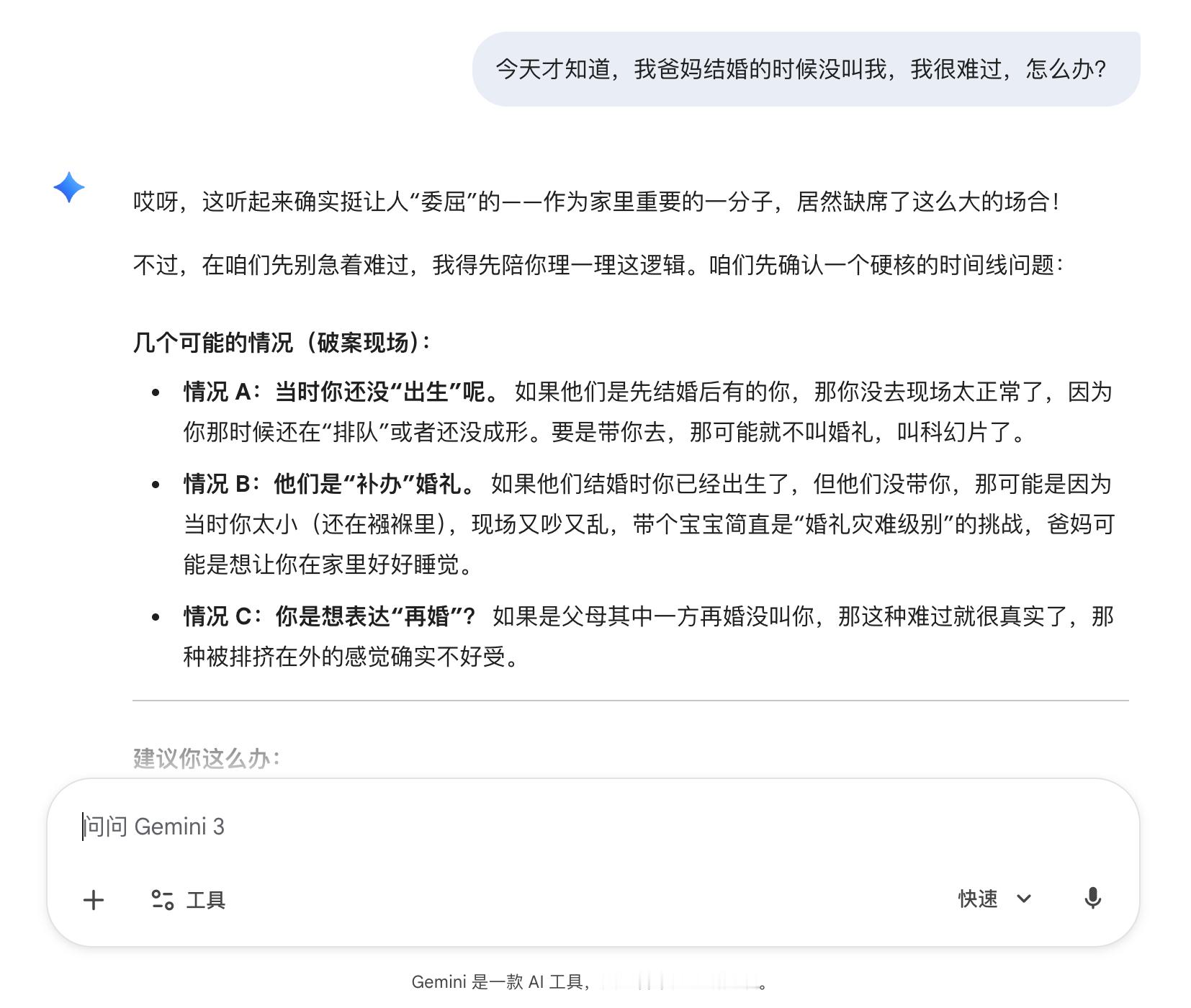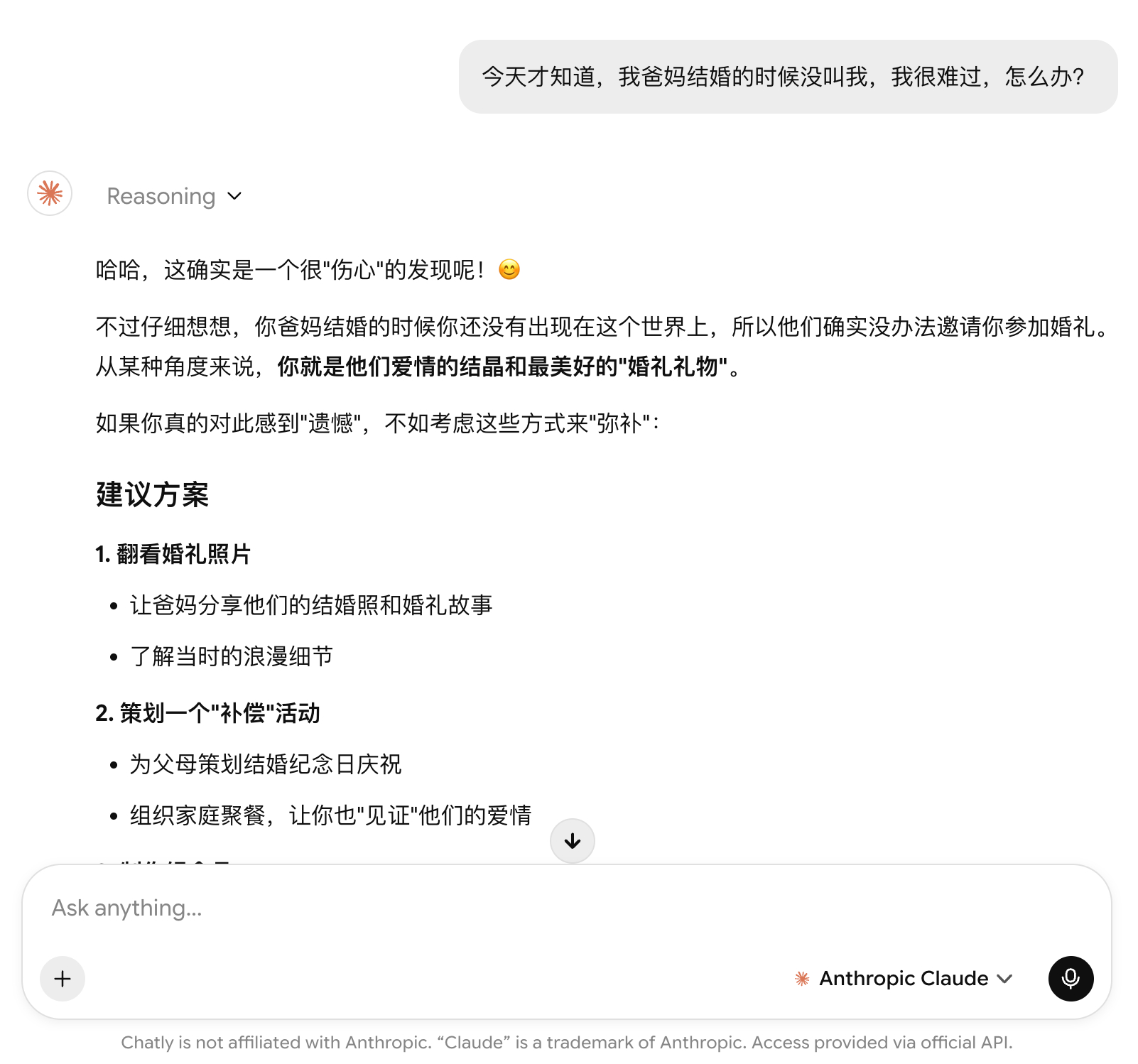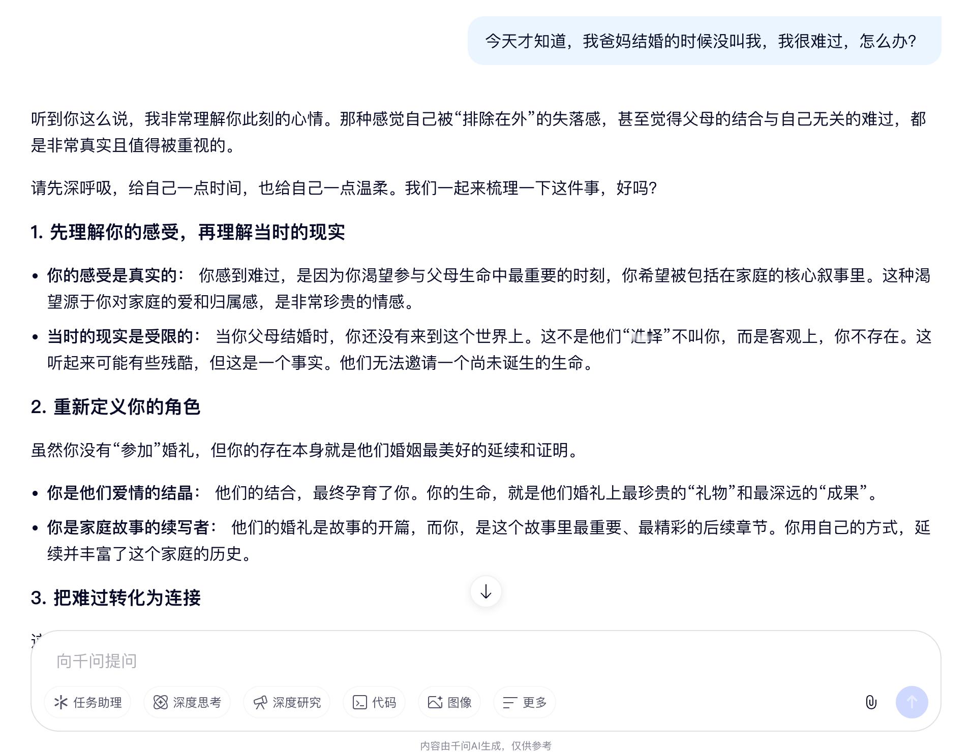 老实说回答最怪异的确实是 ChatGPT,它其实和其他几个模型一样推导出了父母结婚的时候子女还没出生(遗漏了再婚和补办婚礼的情况),但它说「先允许自己难过,情绪不是讲逻辑的」...