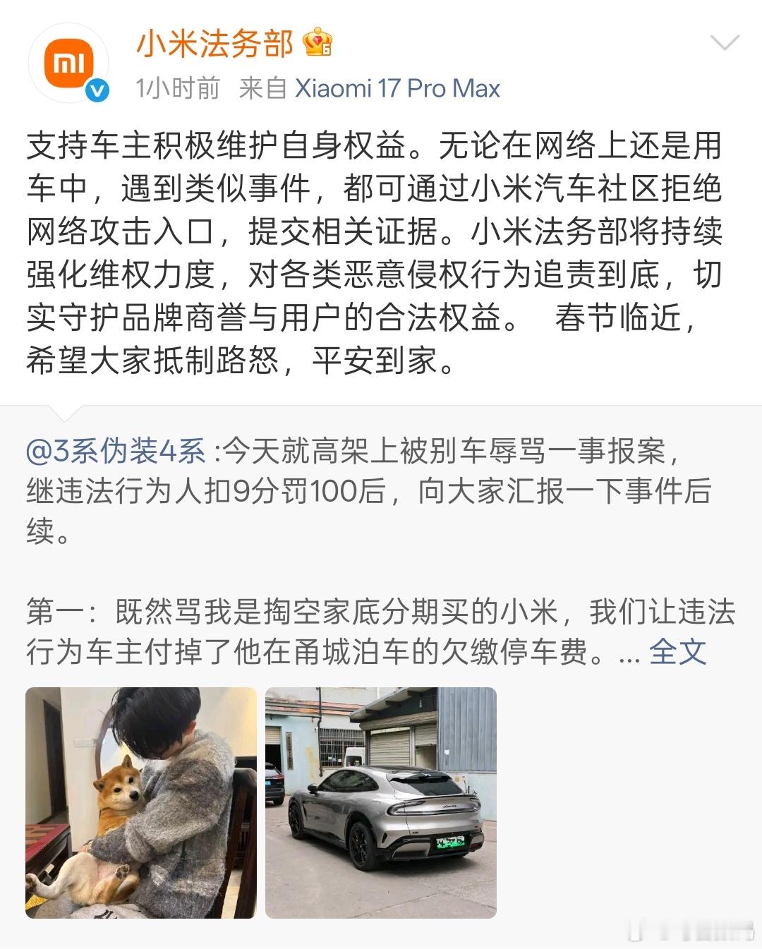 解气!这事前几天刷到了,高架别车还辱骂小米车主。我觉得当时博主的做法挺冷静的,并积极维护了自身的权益。小米官方也是全面支持车主维权。车主可通过小米汽车社区“拒绝网络攻击”入口提交证据,小米法务帮车主追责!当然我觉得无论什么品牌车主,大家还是抵制路怒,遵纪守法。平平安安回家过年
