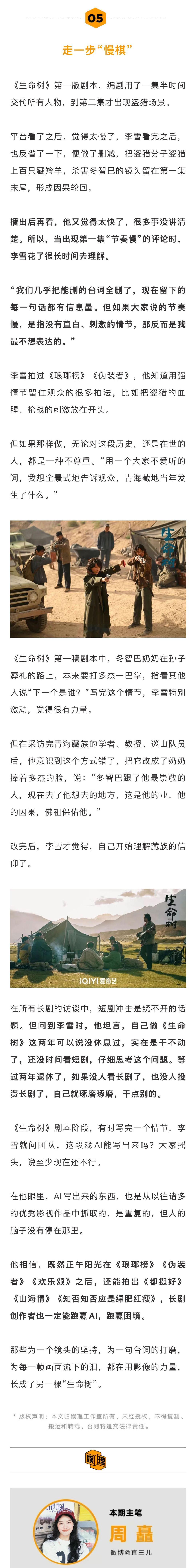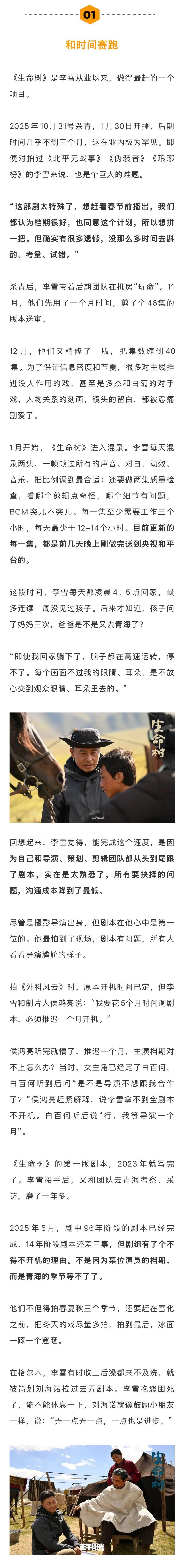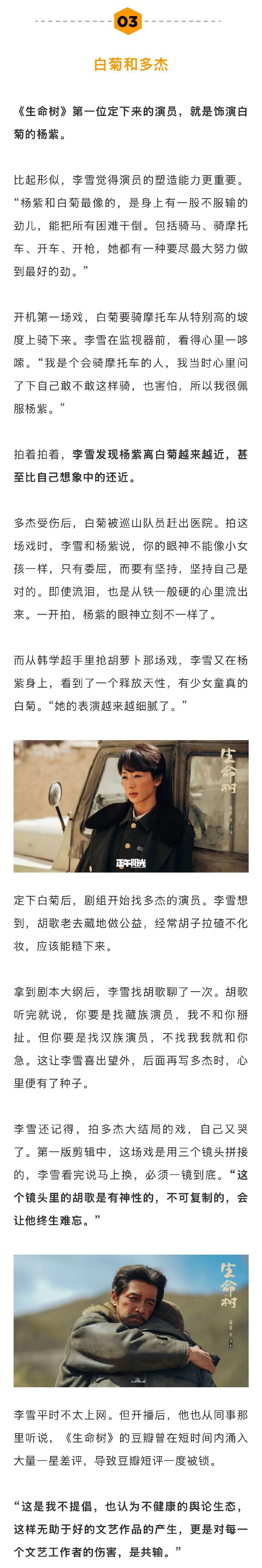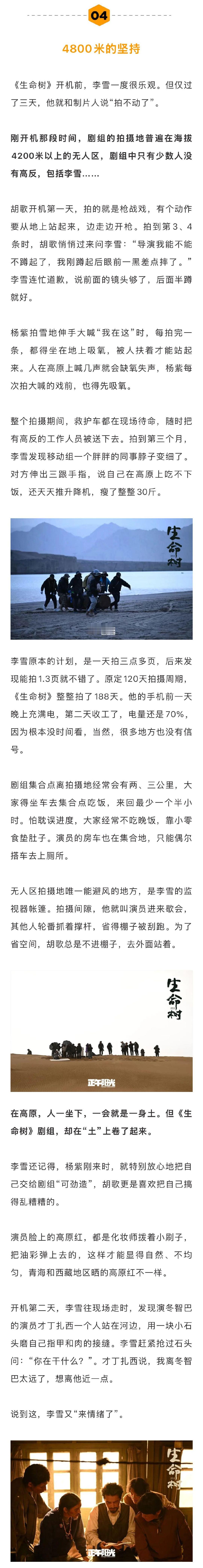 导演回应生命树豆瓣一星差评 生命树导演说很佩服杨紫《生命树》第一位定下来的演员,就是饰演白菊的杨紫。比起形似,李雪觉得演员的塑造能力更重要。“杨紫和白菊最像的,是身上有一股不服输的劲儿,能把所有困难干倒。包括骑马、骑摩托车、开车、开枪,她都有一种要尽最大努力做到最好的劲。” 杨紫胡歌拍生命树都出现了高反↓
