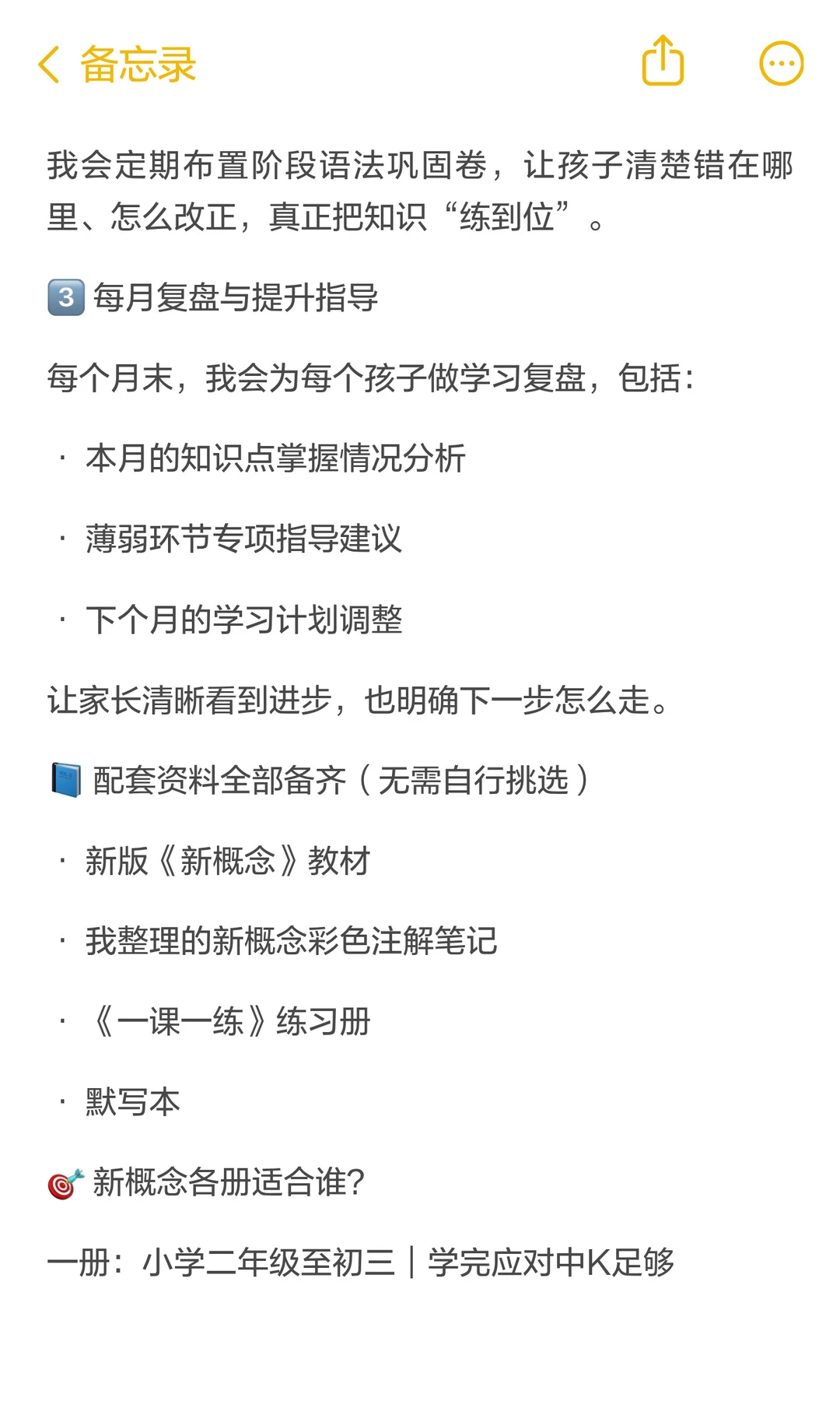 经常有家长问我:老师,新概念能不能在家自学?自学当然可以,但容易坚持不下去、方法走偏、效果看不见。这也是为什么我专门开设了「新概念伴学营」——不是单纯让你看视频,而是有方法、有监督、有反馈的系统学习。 ✅ 伴学营学习模式(闭环设计,杜绝半途而废) 1️⃣ 每周学习安排(总约50分钟) • 20分钟:观看我的精讲视频(词汇+课文+语法+句型+随堂练习) • 10分钟:对照《彩色注解笔记》梳理重点 • 15分钟:完成《一课一练精华版》,观看精讲视频,及时检测掌握情况 • 5分钟:听读学习打卡,养成持续学习好习惯 2️⃣ 作业闭环:学完即练 → 提交批改 → 定期反馈 → 针对性巩固 我会定期布置阶段语法巩固卷,让孩子清楚错在哪里、怎么改正,真正把知识“练到位”。 3️⃣ 每月复盘与提升指导 每个月末,我会为每个孩子做学习复盘,包括: • 本月的知识点掌握情况分析 • 薄弱环节专项指导建议 • 下个月的学习计划调整 让家长清晰看到进步,也明确下一步怎么走。 📘 配套资料全部备齐(无需自行挑选) • 新版《新概念》教材 • 我整理的新概念彩色注解笔记 • 《一课一练》练习册 • 默写本 🎯 新概念各册适合谁? 一册:小学二年级至初三|学完应对中K足够 二册:初三至高三|扎实掌握可冲刺高K 三册:高三至大二|高K、四级轻松过关 四册:大二至考研|托福雅思基础、六级无忧 学英语没有捷径,但有方法、有陪伴、有反馈,孩子才能走得稳、学得牢。 如果你也希望孩子系统学好新概念,了解「伴学营」详细安排 👇
