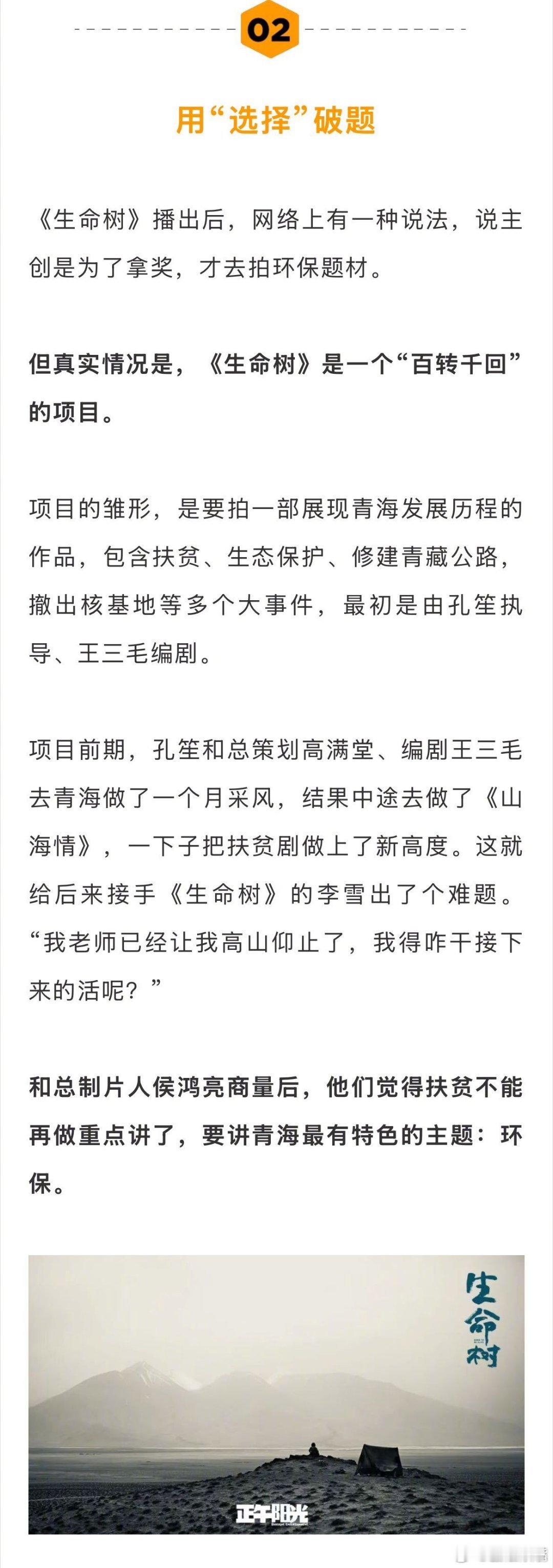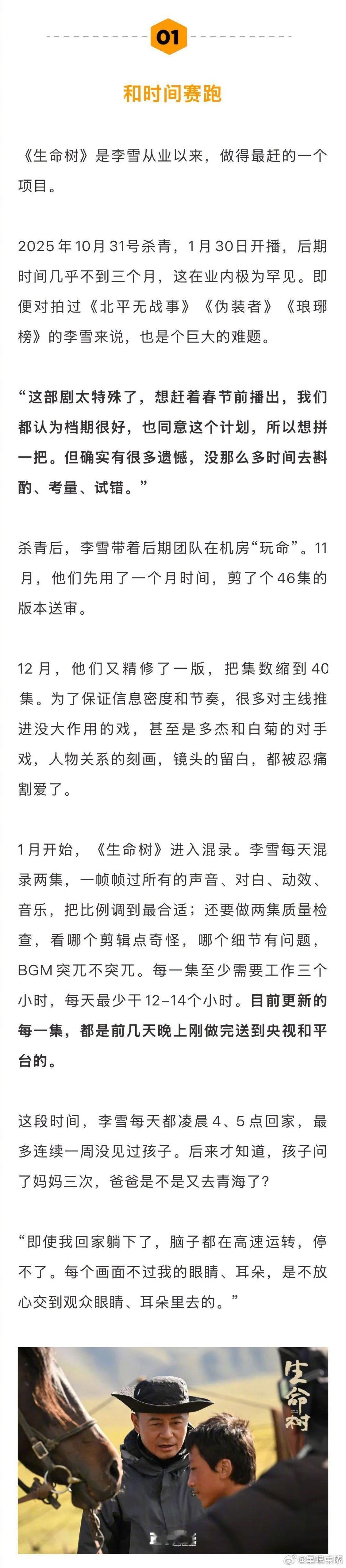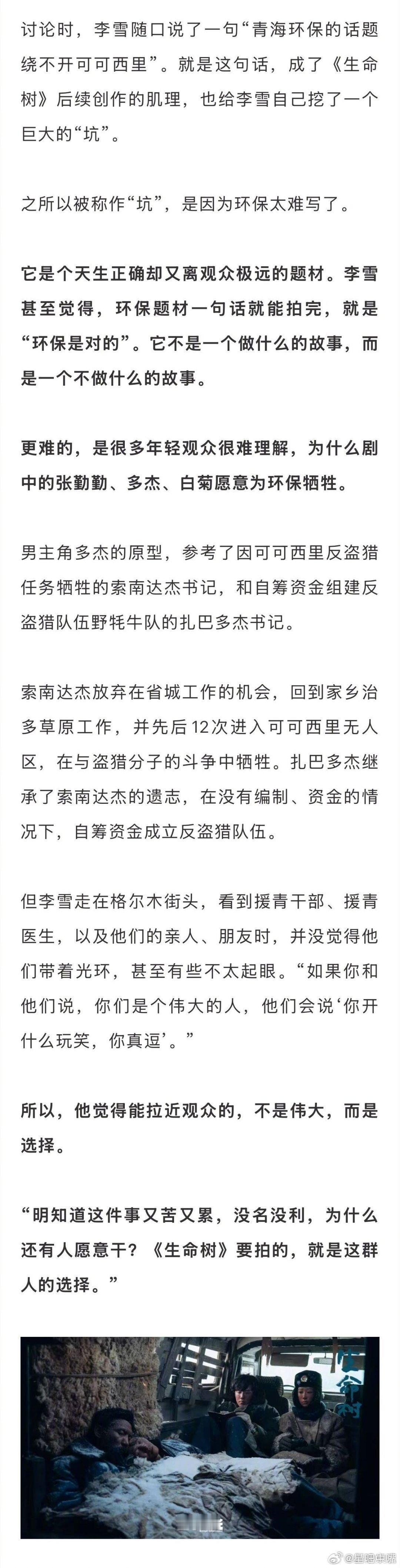 生命树导演回应生命树豆瓣一星差评生命树导演说很佩服杨紫 新浪娱乐娱理工作室对话《生命树》导演李雪,谈了谈拍环保题材的初衷,杨紫、胡歌的选角,节奏慢、热度不够爆的争议等问题。李雪说杨紫和白菊最像的,是身上有一股儿劲儿,能把所有困难干倒。胡歌开机第一天拍的是枪战戏,拍到第3、4条时,胡歌蹲起后眼前一黑差点摔了。