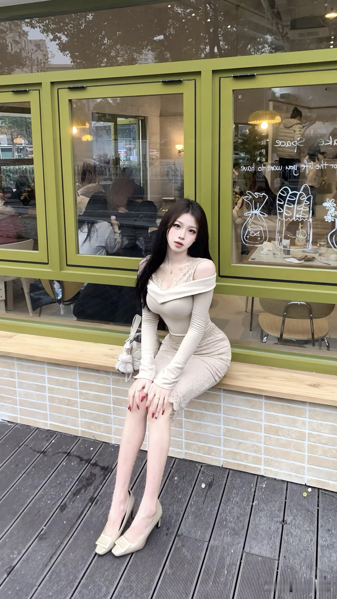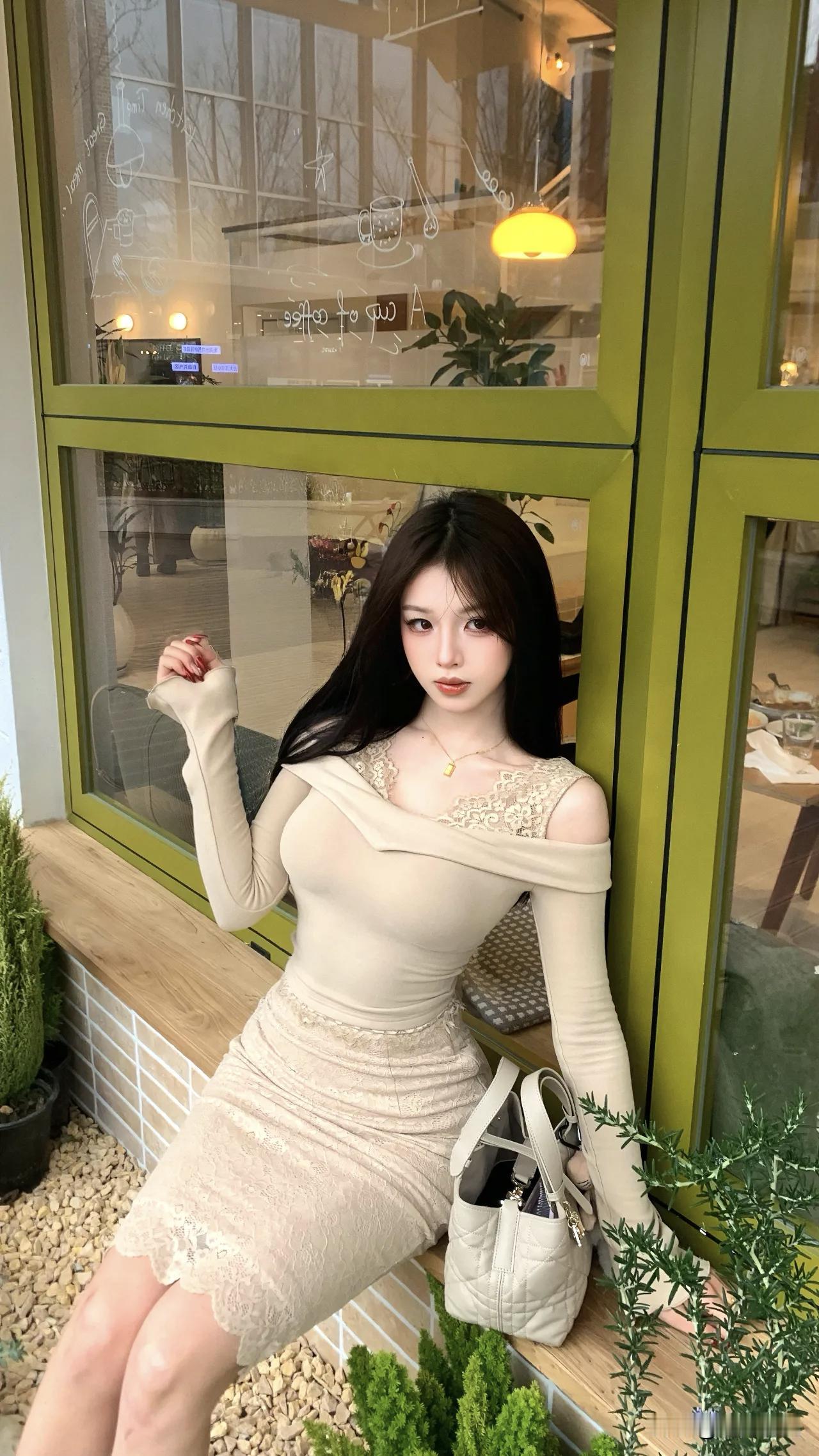今日街拍干货:靠窗抬手,一秒拉长身形! 绿窗咖啡馆的暖黄光里,只需一个动作——侧靠窗边,抬手轻搭肩头,就能让整个人显得修长舒展。试试让背部轻贴玻璃,单臂弯曲抬起,另一只手自然撑住凳面,锁骨处的米杏色一字肩顺势垂落,蕾丝裙摆轻贴腿侧。眼神平静看向镜头,窗上的涂鸦和室内的吊灯在背景里化成柔光,画面瞬间有了“被抓拍的日常感”。 这个小动作的秘诀在于:利用窗框稳定构图,手臂抬起拉长肩颈线条,微微侧身突出腰线。其他几个姿势也值得一试:收腿坐窗台延伸脚尖、拎包慢步低头营造氛围、侧坐仰头放松肩背……记住“坐定—靠窗—走动—再坐定”的节奏,就能拍出既有细节又不失整体的街头暖调大片。 穿搭上,米杏色系在暖光里格外柔和,一点蕾丝边和红色指甲提亮全身。拍照不仅是摆姿势,更是把场景、光线和心情都收进镜头里。下次路过暖光灯下的窗边,不妨停下来,用这个动作留住初秋的温柔片刻吧。 拍照显腿长