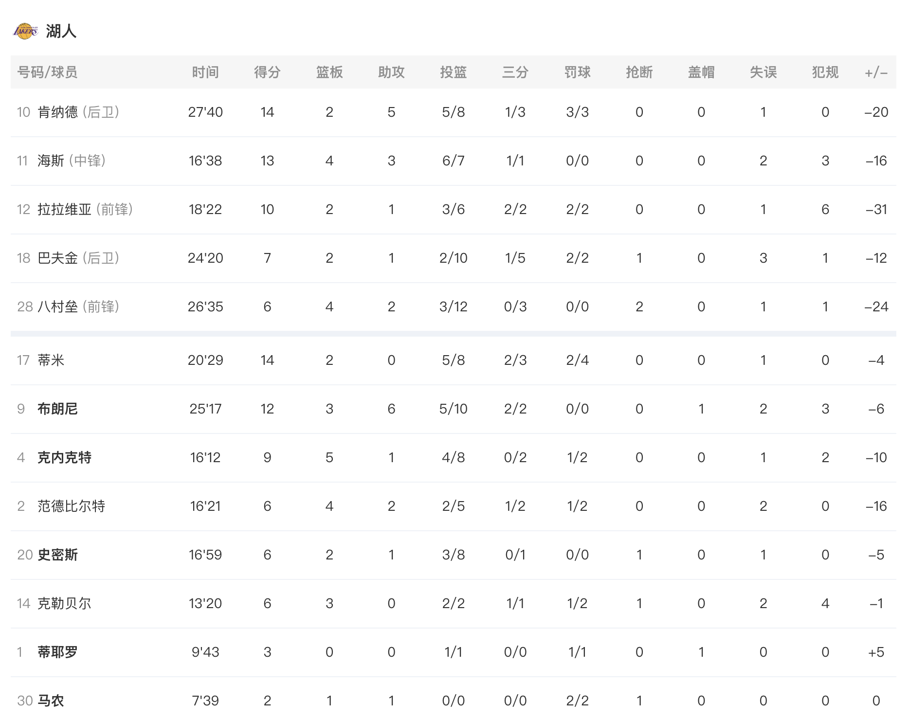 拉拉维亚10分2篮板,八村6分4篮板2助攻,海斯13分4篮板3助攻,肯纳德14分2篮板5助攻,科比·巴夫金7分2篮板,布朗尼12分3篮板6助攻1盖帽,蒂米14分2篮板,范德彪6分4篮板2助攻,史密斯6分2篮板,克内克特9分5篮板,克勒贝尔6分3篮板,阿杜3分,马农2分。