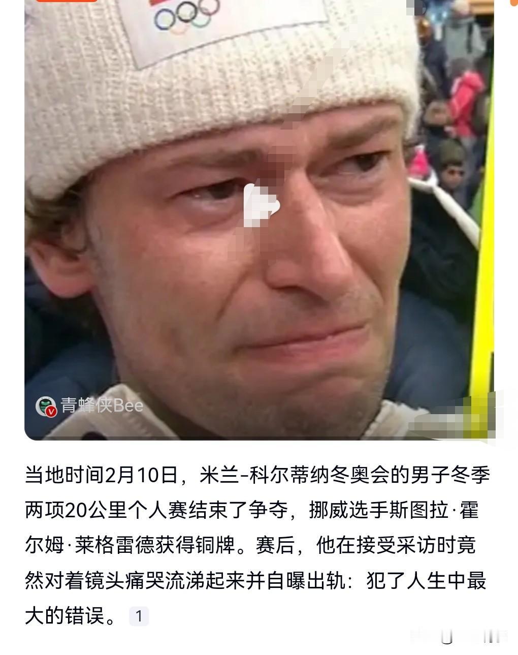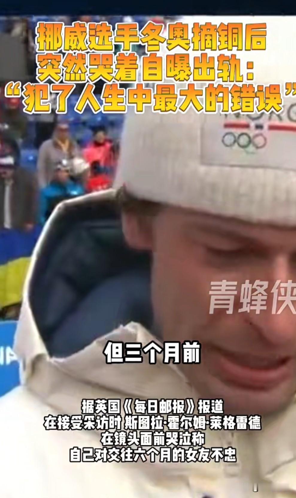 这着实有点魔幻了。还有自爆丑闻的? 当地时间2月10日,挪威选手冬奥摘铜后哭着自曝出轨。 说半年前认识了世上最美丽最善良的女友,在三个月前他出轨了。 而且一周前就告诉过女友了。 不知道大庭广众之下自曝丑闻,能不能赢回女友的心。