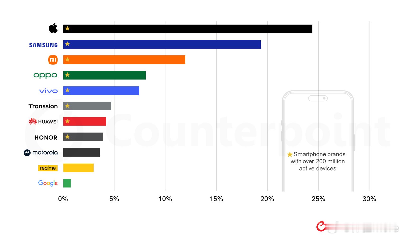全球每4部手机就有1部iPhone全球每5部手机就有1部三星全球每8部手机就有1部小米