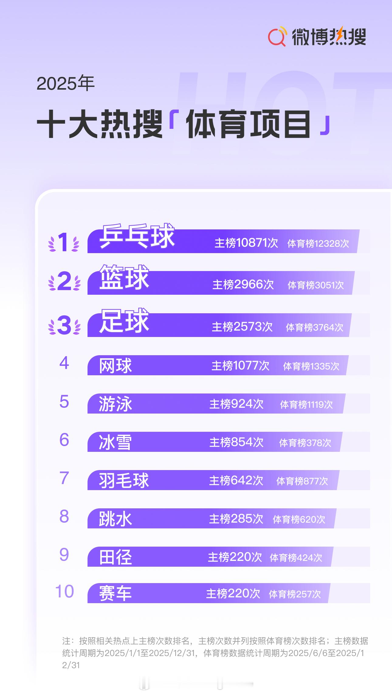 十大热搜体育项目1 乒乓球2 篮球3 足球4 网球5 游泳6 冰雪7 羽毛球8 跳水9 田径10 赛车