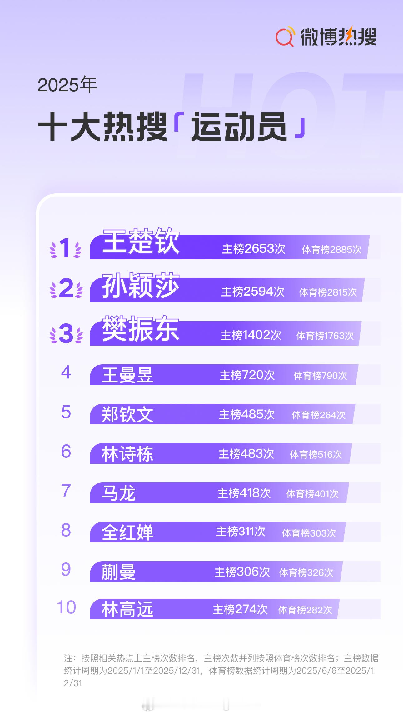 2025微博热搜趋势报告 十大热搜运动员1 王楚钦2 孙颖莎3 樊振东4 王曼昱5 郑钦文6 林诗栋7 马龙8 全红婵9 蒯曼10 林高远