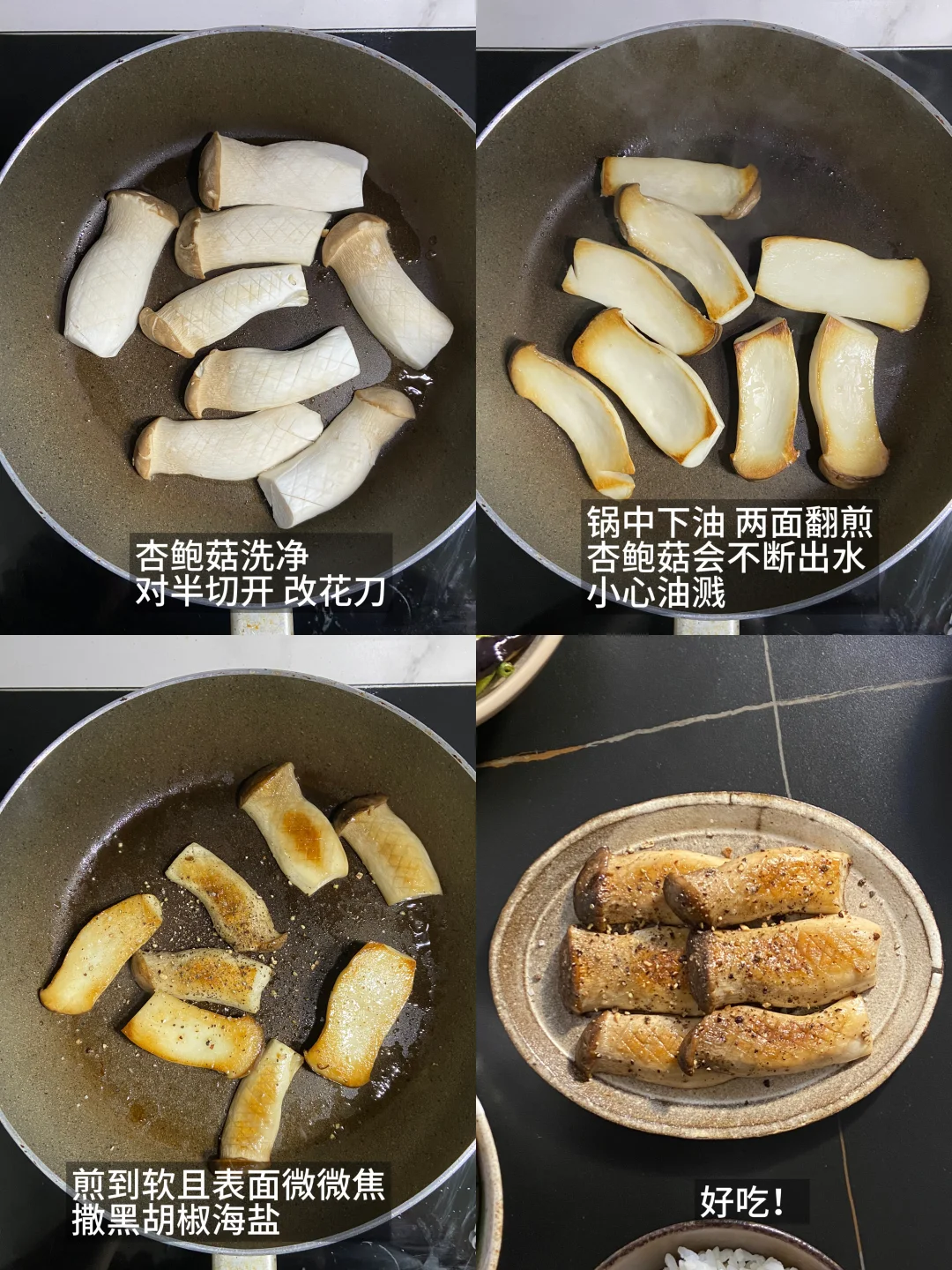 1)杏鲍菇划花刀,放锅中煎到两面焦黄即可,盛出撒黑胡椒海盐