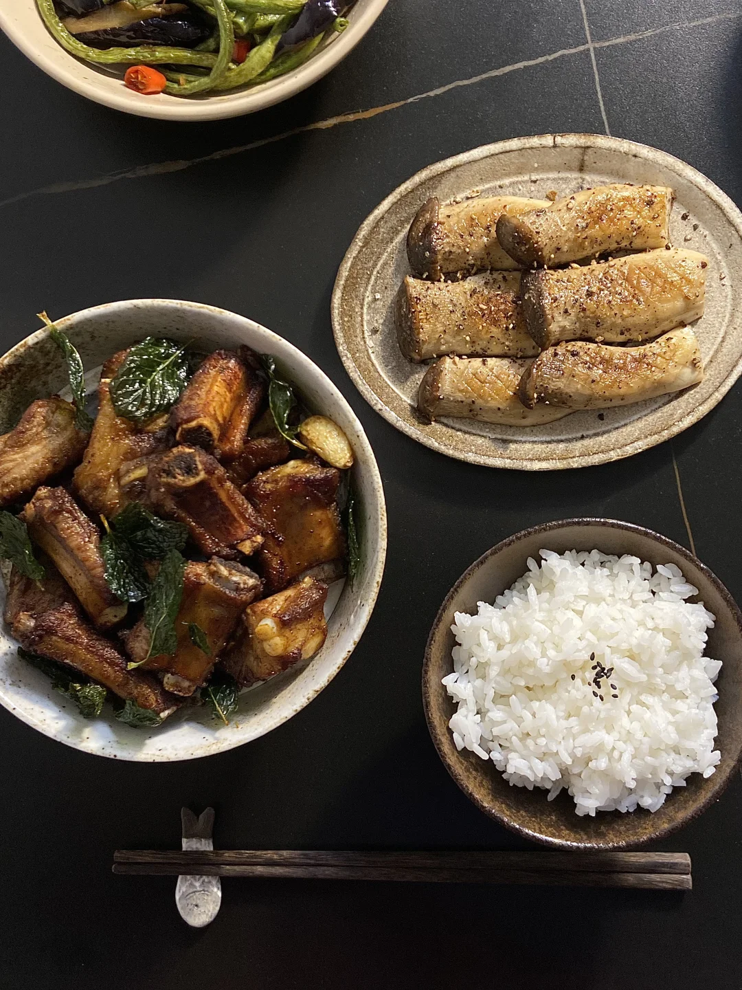 4)最后把薄荷、干辣椒、蒜瓣放在排骨上开吃