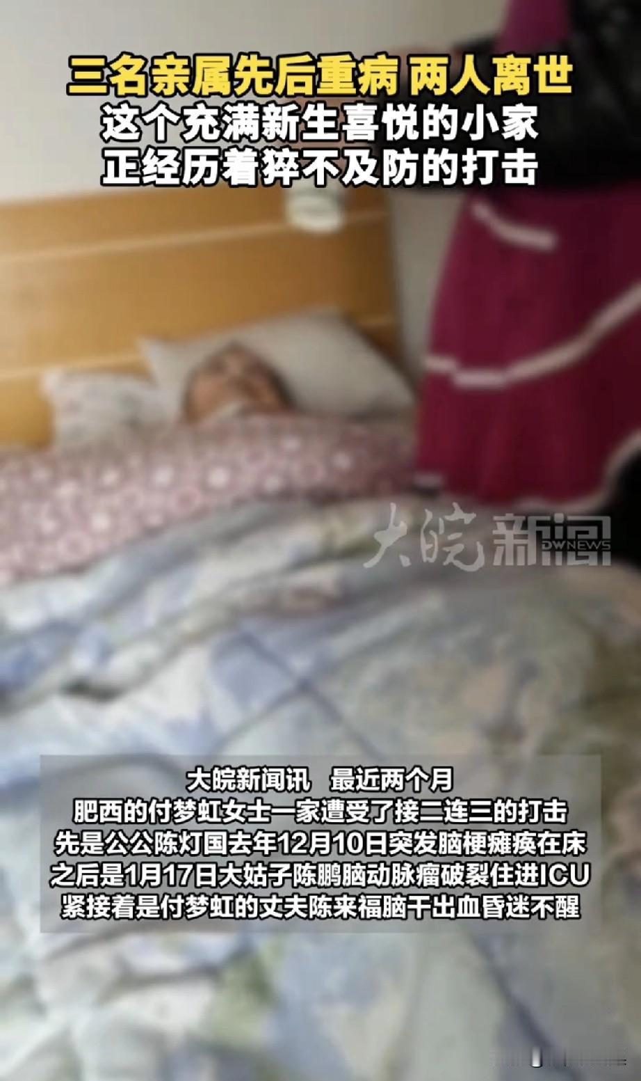 你是觉得世界上最惨的事是什么? 不是没钱,不是没房,而是亲人躺在病床上,你掏空了所有积蓄,拼尽了全力,最后却还是没能把人留住。 安徽肥西的付梦虹,刚迎来9个月大的女儿,本该是充满新生喜悦的小家,却在短短两个月内被命运狠狠碾压。公公突发脑梗瘫痪在床,大姑子因脑动脉瘤破裂住进ICU,丈夫又突发脑干出血陷入昏迷。真是麻绳专挑细处断,厄运专找苦命人! 她砸锅卖铁,借遍亲友,把全家的积蓄都砸进了医院,可还是没能留住公公和丈夫。两天之内,两位至亲相继离世,ICU里的大姑子仍在抢救,家里还有嗷嗷待哺的女儿和年迈的婆婆。 最痛的不是没钱治病,而是钱花光了,人却走了。 最苦的不是独自扛下一切,而是明明拼尽全力,却还是留不住想留住的人。 愿这个家能撑过寒冬,也盼更多人能伸出援手,帮她们渡过难关。同时也提醒所有人:重视体检,别忽视身体发出的信号;提前做好家庭保障,愿大家都平安健康! 《信息来源于大皖新闻》