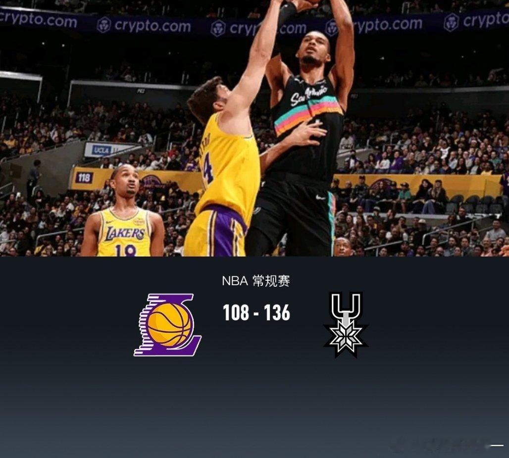 第四节,马刺换下主力进入练兵时间,开节5分钟马刺进攻持续哑火,湖人蒂米领衔轰出一波15-2追至21分,紧跟马刺一波9-0稳住局面,最终湖人108-136不敌马刺。