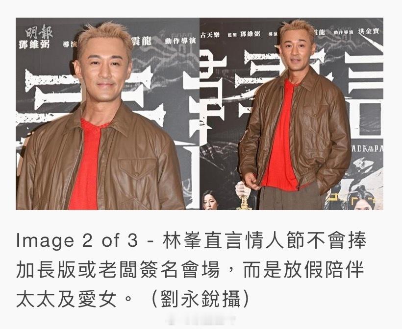他直言情人節不會捧加長版或老闆簽名會場,而是放假陪伴太太及愛女,「個幾月沒有見個女,得一個星期假,過完年初三便要開工。」同場的姚瑩瑩及雪梨,難得與林峯「母子重逢」,問可希望開拍續集有份參演,2位劇中母親表示隨緣及順其自然,姚瑩瑩笑道:「我們個仔(林峯)都已成家立室,好安慰。」