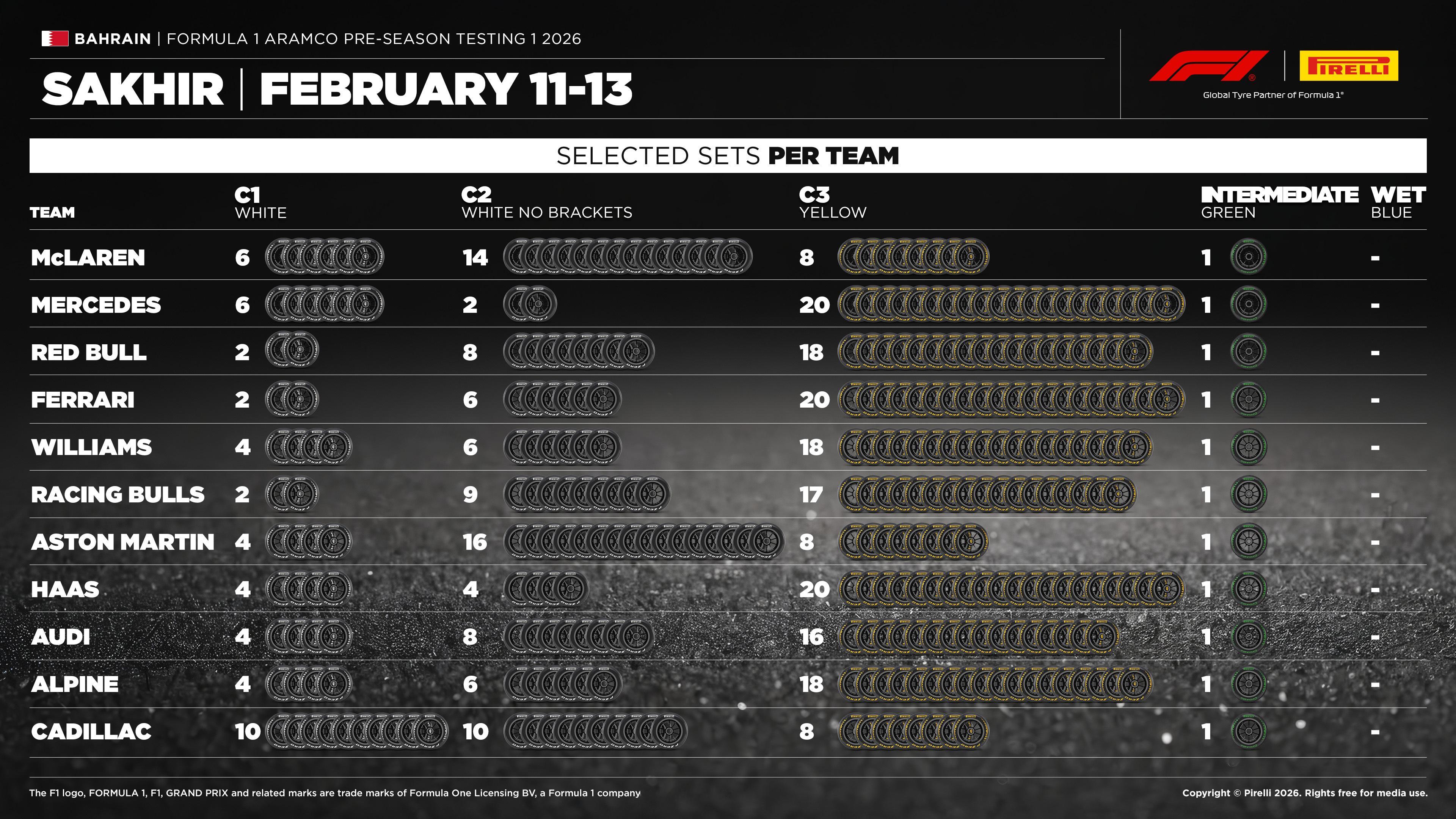 倍耐力公布巴林季前测试轮胎选择:11-13日第一轮测试:C1-C3(最多使用28
