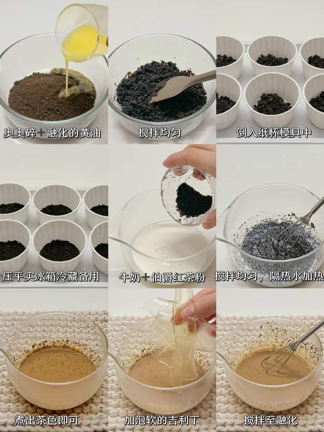 2️⃣牛奶加伯爵红茶粉搅拌均匀,隔热水加热出茶色,加泡软的吉利丁搅拌融化备用。