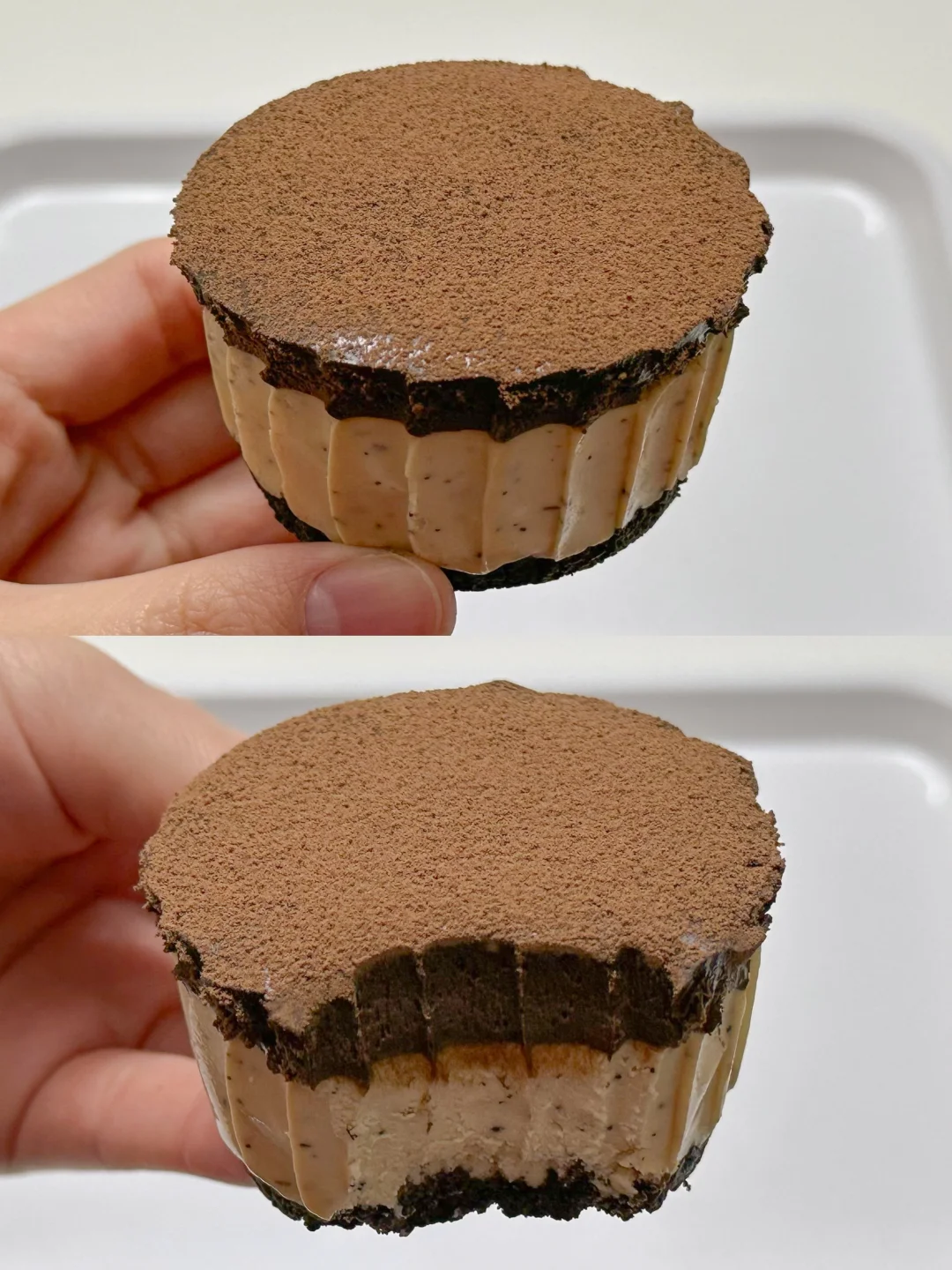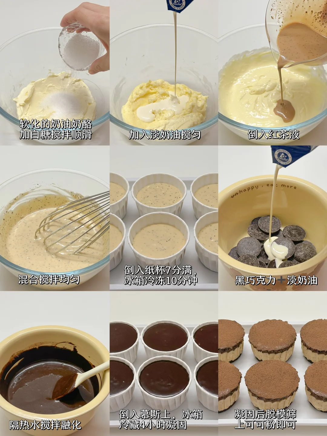 3️⃣软化的奶油奶酪加白糖搅拌顺滑,加入淡奶油搅匀,倒入红茶粉混合搅拌均匀,倒入纸杯7分满,冰箱冷冻10分钟。