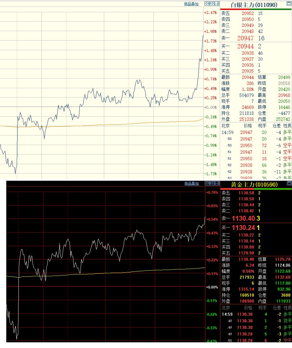 2月11日, 国内黄金和白银齐刷刷上涨, 而且两者的走势基本相同。 都是日内恢复交易以后, 直线拉升,快速止跌回升。 然后白盘高位运行, 尾盘再度出现一波拉升。 不同的是,尾盘白银创出日内新高。 截止15:00, 国内黄金期货收盘于1130.4元, 较上一日上涨0.56%; 白银期货主力收盘于20944元, 较上一日上涨1.88%。 黄金和白银有望继续上涨!
