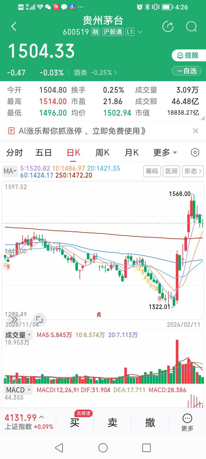 贵州茅台股价调整到位了吗? 贵州茅台股价今天收盘微跌0.03%,成交金额梯次萎缩到46.48亿元。似有跌不动并止跌于10日均线的可能。 目前贵州茅台股价年线在1472.20元,看今天的走势不排除贵州茅台股价不回抽年线,只强势调整到10日均线处受到支撑后就掉头向上了。 明天的走势很关键,如果明天贵州茅台股价放量上攻,可能意味着贵州茅台股价反转趋势得到了进一步确认。